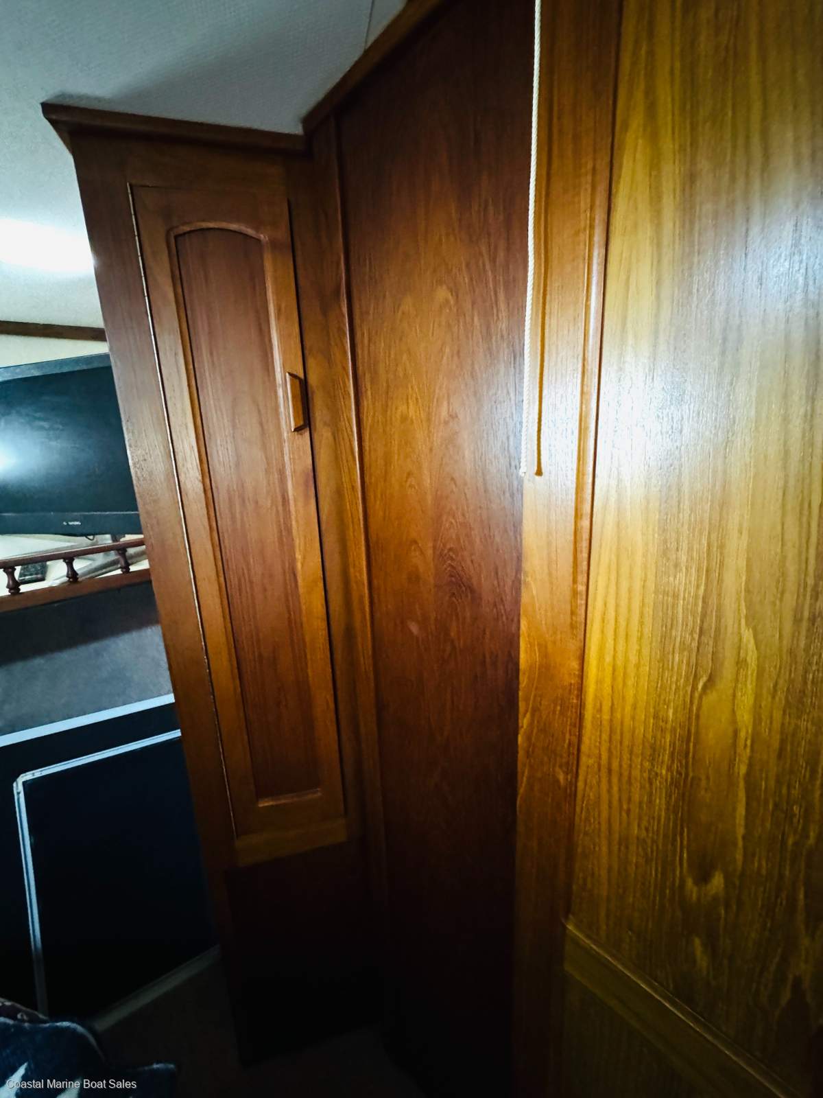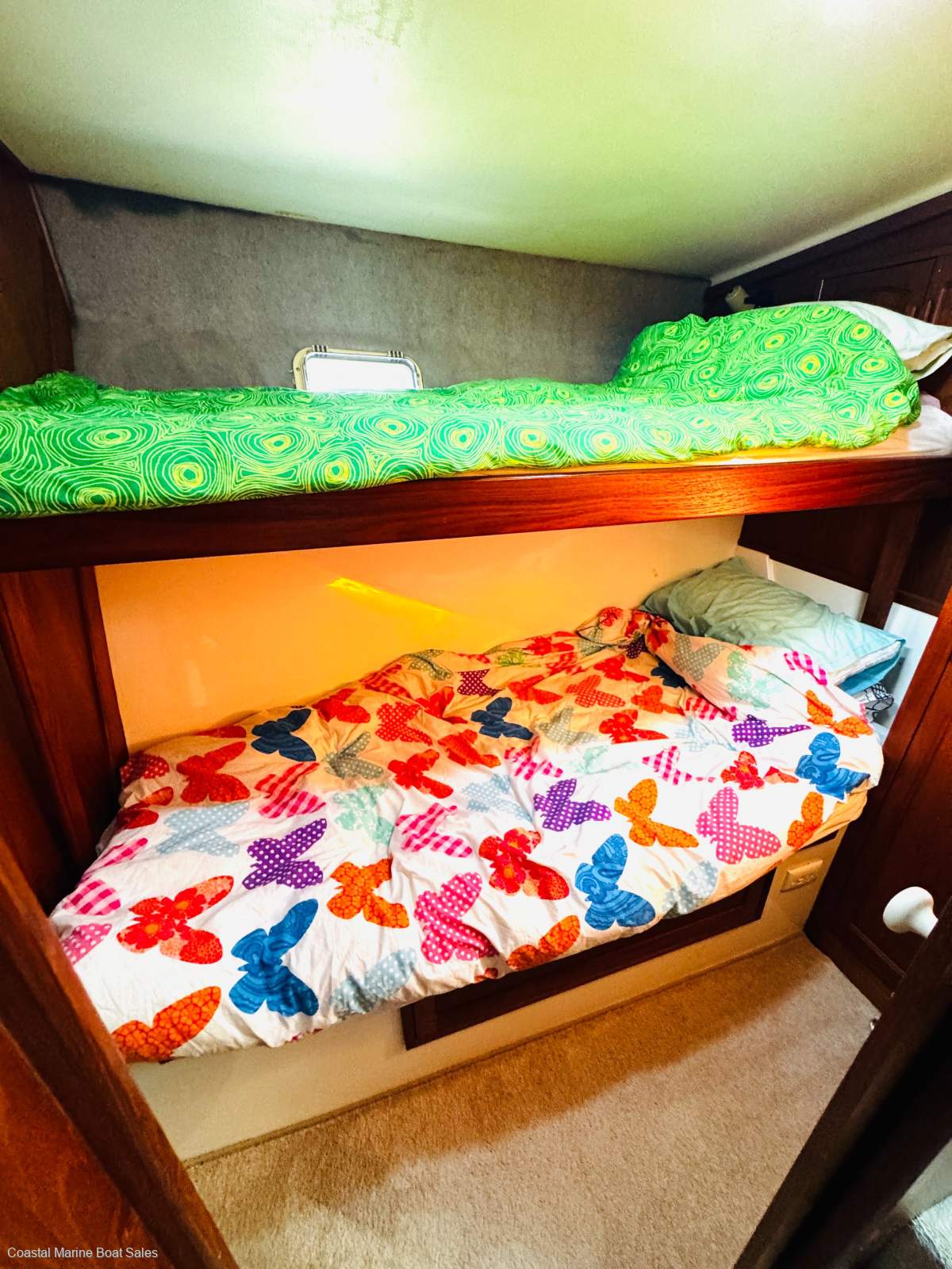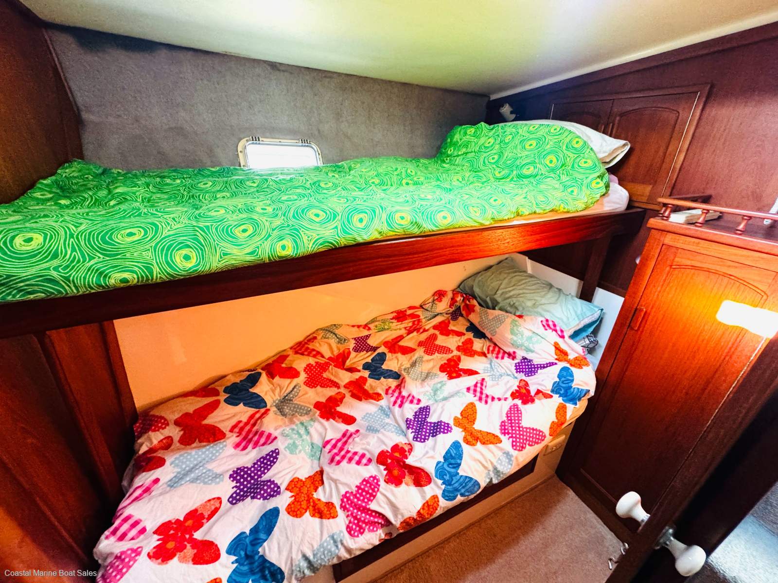 ACCOMODATION - Forward stateroom with walk around island double bed. Starboard side cabin has 2 large bunk beds and storage.