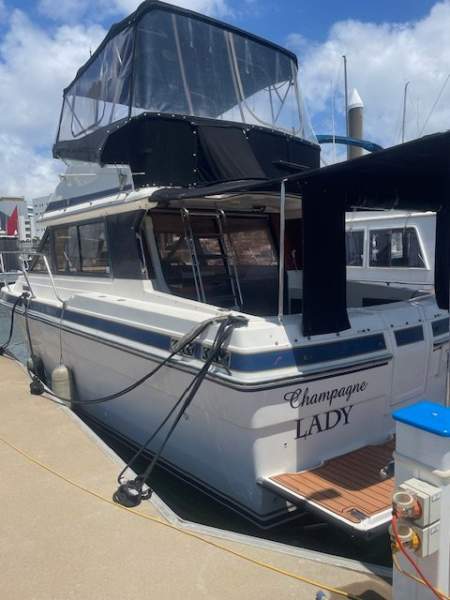 The back deck is fully covered with near new canvas covers and drop-down sides, plenty of storage, deck shower, wash basin and stairs that lead to the impressive flybridge.