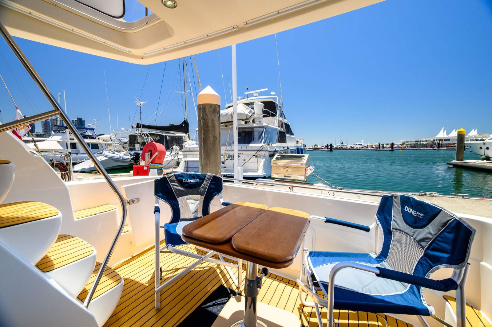 The interior layout is intelligently arranged to maximise space, natural light, and liveability. Two well-appointed cabins provide comfortable accommodation, including a private owner's cabin with direct access to the en-suite bathroom. The bright and inviting saloon is enhanced by large panoramic windows, creating an open and airy atmosphere throughout. Above, the flybridge features a dedicated helm station with excellent visibility and generous seating, providing the perfect vantage point for relaxed cruising or enjoying sunset views at anchor.