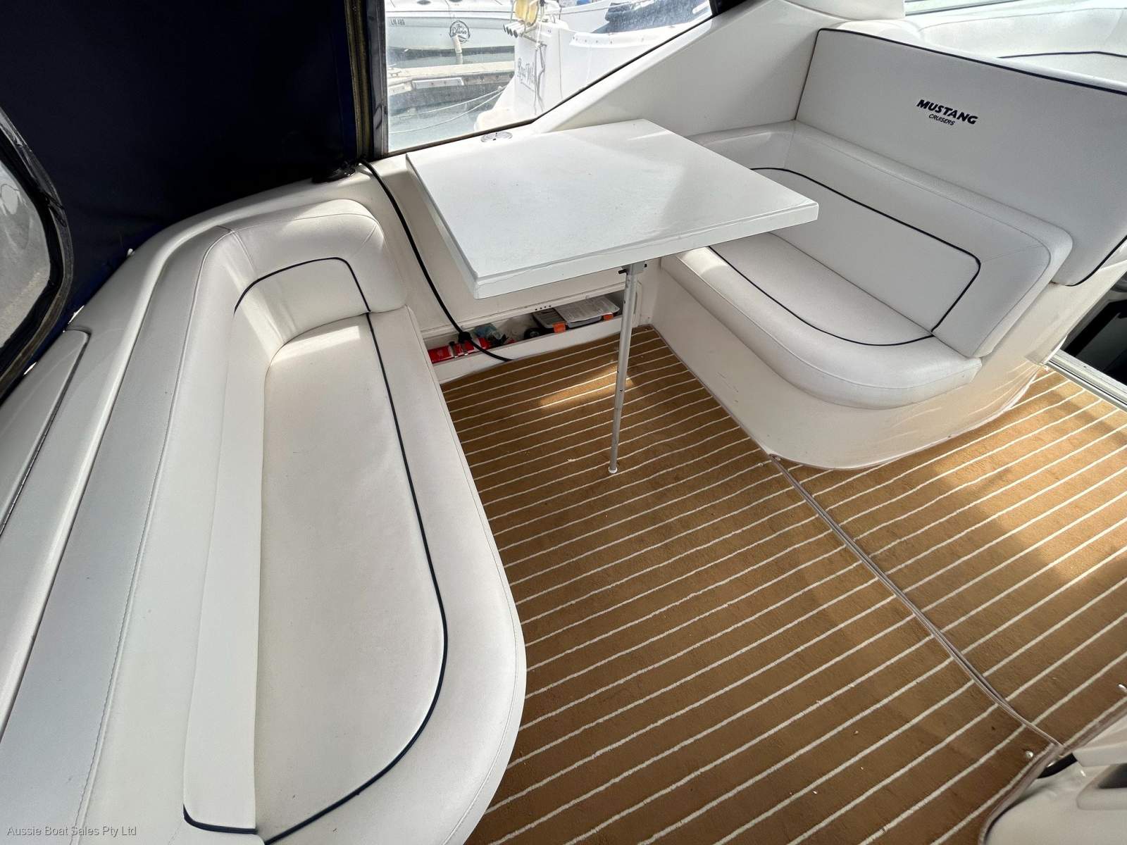 Mustang 2800 Sports Cruiser, 2001, Mercruiser 5.0L EFI 260 HP V8,(close circuit cooled) bravo stern drive, this boat had major engine out mechanical work undertaken during covid, including new riser manifolds, new transom plates and reconditioned cylinder heads, at the same time the hull was 2 pack painted, an upgraded Garmin GPS/Sounder, and Seadeck on the swim platform was added along with a bunch of other upgrades. Since then, the cockpit has been re-upholstered and general maintenance has been diligently carried out with annual services, antifoul and detailing. This tidy boat is nicely optioned with stainless stern rail, BBQ and bait board set up, transom shower, swim ladder, Trim tabs, electric anchor winch with chain counter, cockpit carpets, Pressure hot water, 12/240V fridge, dual fuel stove, 240 Volt shore power with battery charger, TV/DVD, C. D Stereo, VHF & 27MHZ radios and more! This is a nice example of these popular entry level cruisers, a marina berth is available in Williamstown for you to enjoy. NB: trailer not included