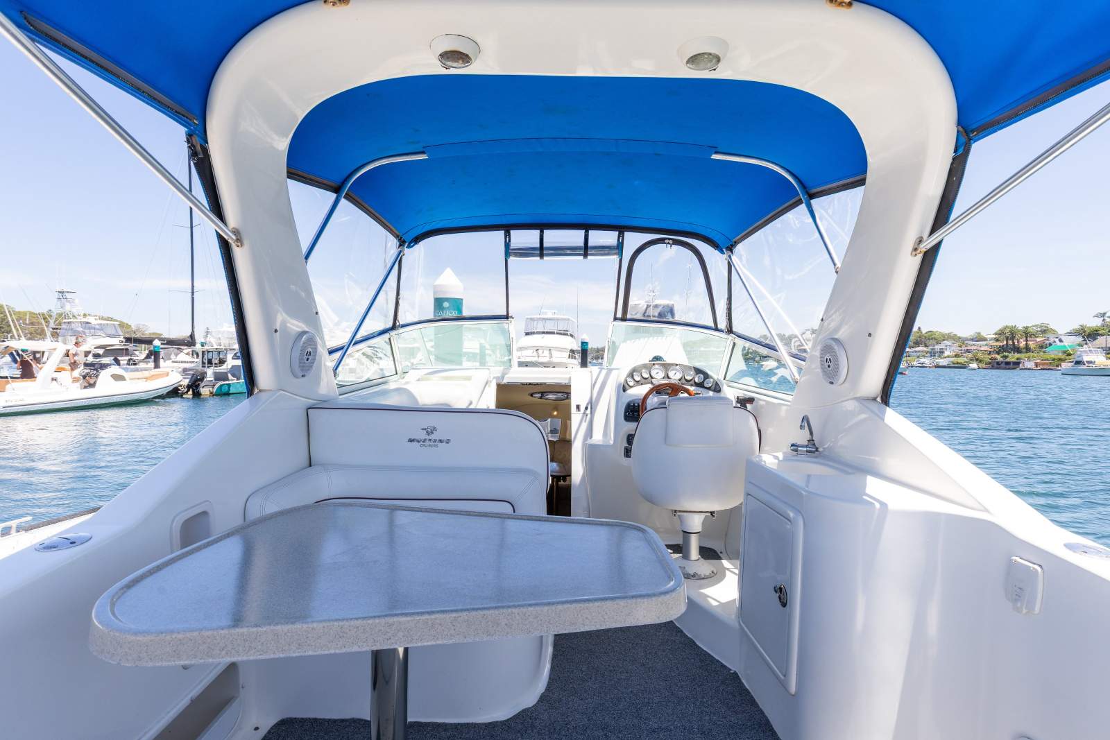 The layout features a generous cockpit with wraparound seating, wet bar, and easy access to the swim platform, making it well suited to social boating and day trips. Below deck, the cabin includes a forward V-berth, mid-cabin double, compact galley and enclosed bathroom, providing comfortable overnight capability for couples or small families.