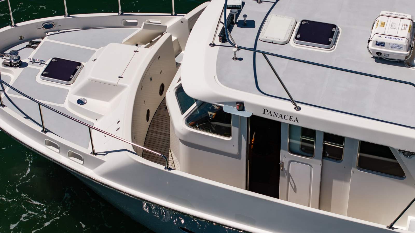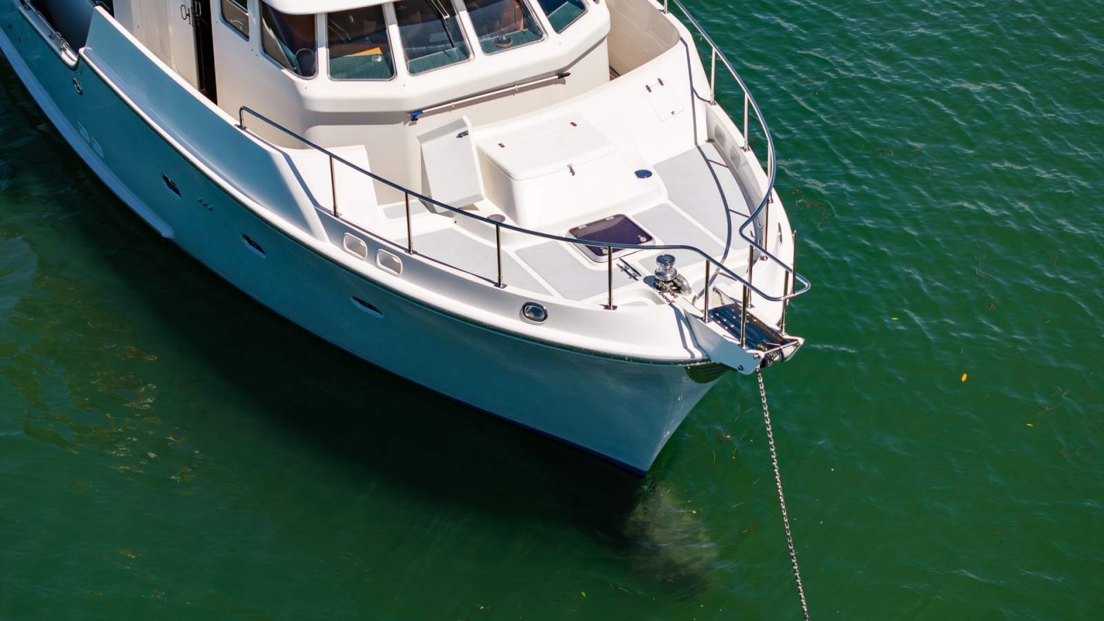 The Nordhavn's solid fiberglass hull, deep forefoot, and full displacement design provide outstanding stability and sea-keeping. With her high bow, soft ride, and self-righting hull form, she instills total confidence in challenging offshore conditions. Her Portuguese bridge and full walkaround decks ensure safety underway, while her substantial ground tackle and oversized hardware speak to her expedition-level construction.