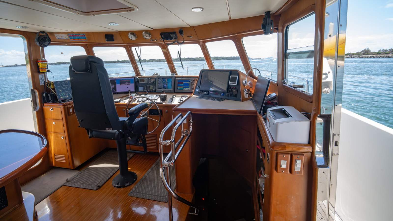 The pilothouse, the heart of every Nordhavn, provides commanding visibility and protection. Outfitted with a comprehensive suite of navigation equipment, dedicated seating, and a convertible watch berth, it's a true captain's domain designed for serious passagemaking.