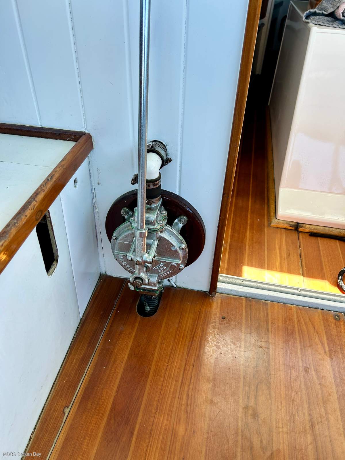 Manual pump at helm. Electric pump with float switch.