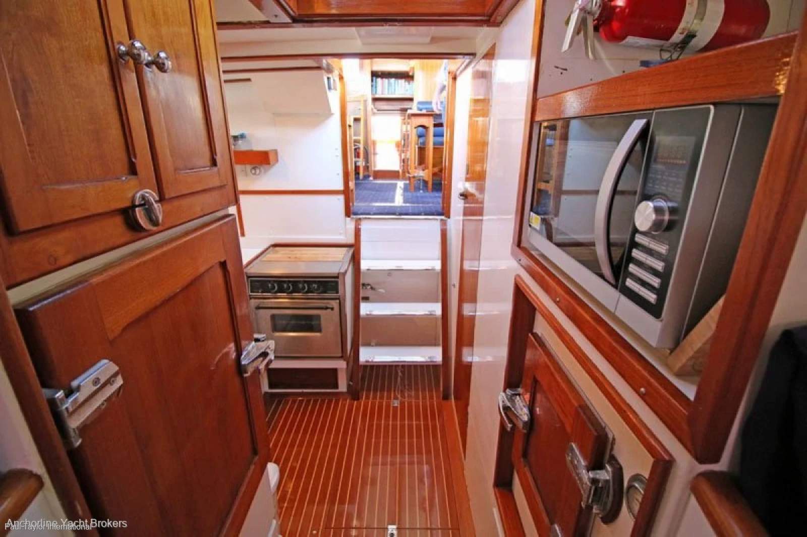 The galley is conveniently positioned forward of the main saloon and fully equipped for onboard living: