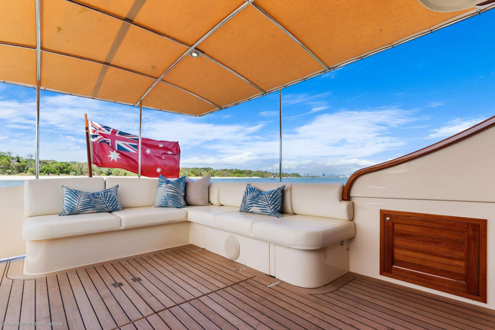 Her breathtaking Palm Beach lines capture the attention of boat enthusiasts wherever she cruises. Her wide teak laid swim platform features a single entry off the swim platform into the cockpit on the starboard side of the vessel. Entering her cockpit, it has been configured for entertaining with the single entry arrangement to the cockpit permitting a larger L-shaped cockpit seating arrangement across the transom, which can convert into a spacious day bed. At the front of the cockpit to port, you will find a sink, storage, Isotherm ice maker and to starboard are two Isotherm under bench side-by-side fridges to ensure guests are always well hydrated! In addition to her well-laid-out cockpit entertaining area, she features a portable Weber Pulse electric BBQ that can be stored away in the spacious lazarette accessed via four large deck hatches under the cockpit sole. The cockpit's saloon bulkhead boasts a high gloss teak finish with a centreline door leading to a signature Palm Beach saloon.
