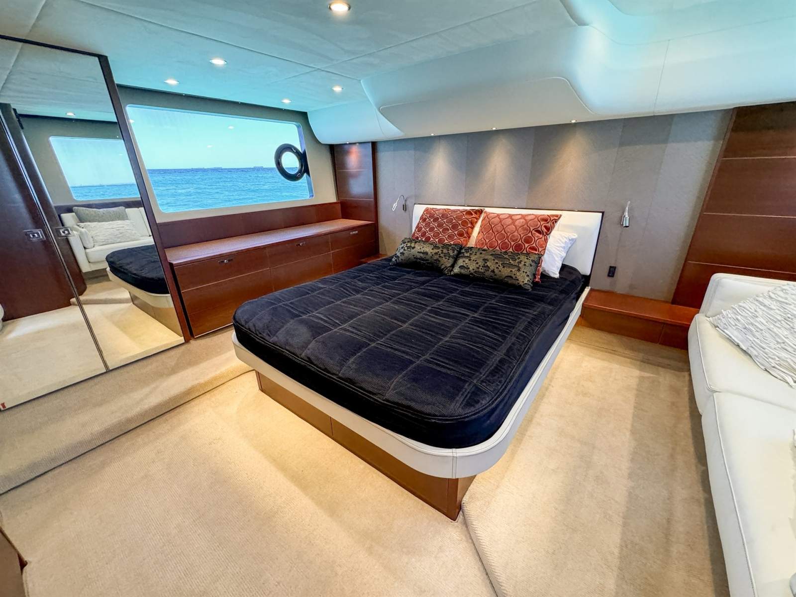 - Full beam master stateroom with en suite, large VIP cabin forward and twin cabin to starboard (bunks electronically slide together to make a double).