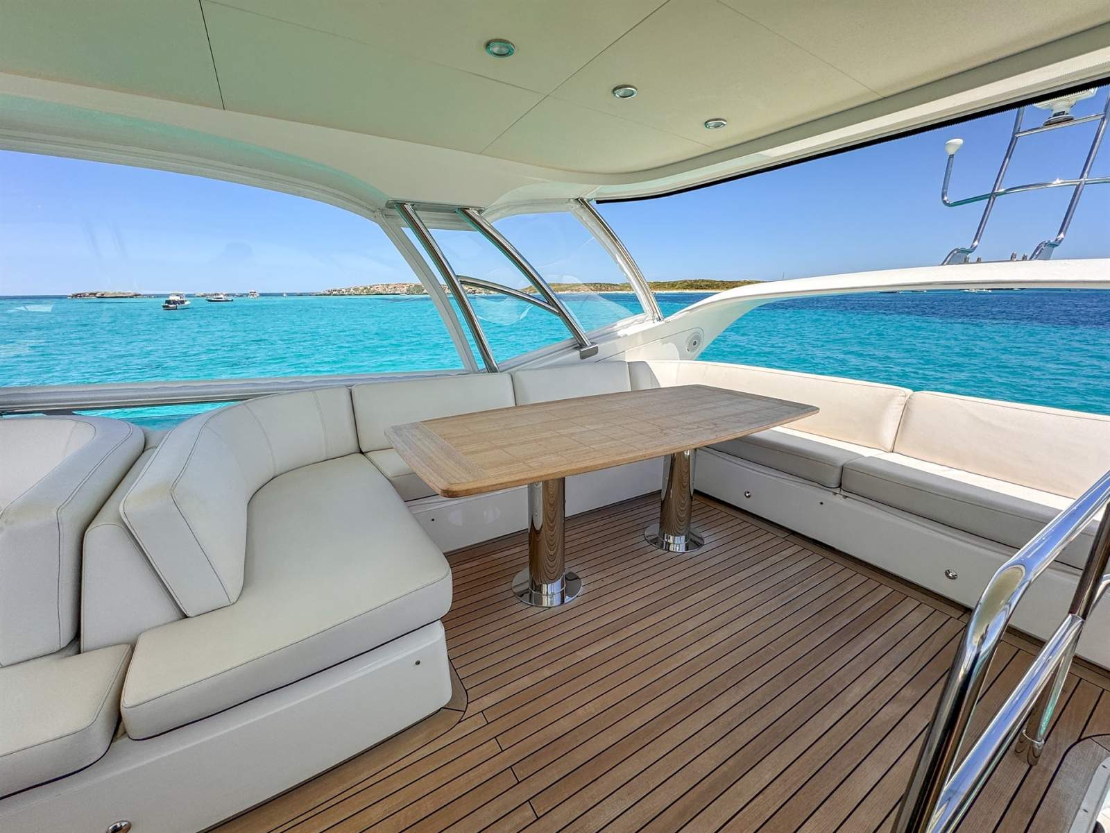 Whether you're seeking family-friendly adventures on the water or an intimate couples getaway, the Princess P56 is designed to cater to both. With its spacious cabins, lavish en suites, and versatile living spaces, every moment on board is an opportunity to create unforgettable memories. The expansive flybridge caters to all guests onboard with lounge seating for at least 10 around the raw teak table, a lounge/day bed adjacent to the helm, a wet-bar with fridge, sink and 240V BBQ all protected from the elements by the full-length custom hard top canopy.