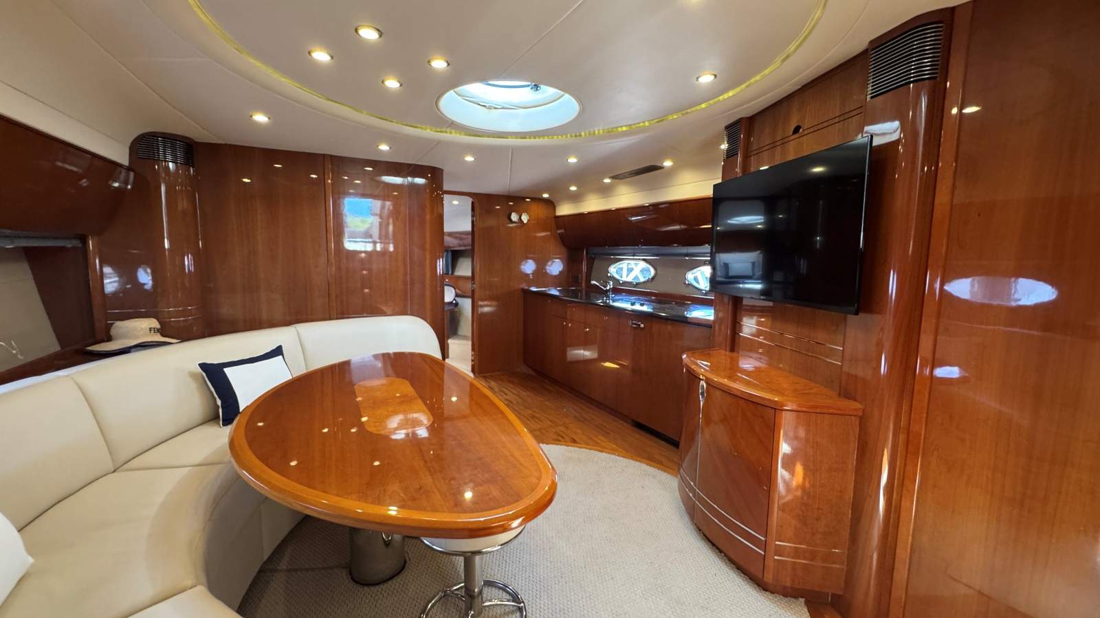 Stepping aboard, you're immediately welcomed by the signature open-sports layout. The electric sunroof floods the cockpit with natural light, creating a bright, breezy, and relaxing atmosphere ideal for long summer days. Generous seating, thoughtful lounge zones, and superb flow between spaces make her a natural entertainer. The expansive aft sun lounge connects seamlessly to the alfresco dining area with plush U-shaped seating, BBQ and wet bar, while forward you'll find a second sun lounge--perfect for sunset cocktails or a quiet morning coffee at anchor.