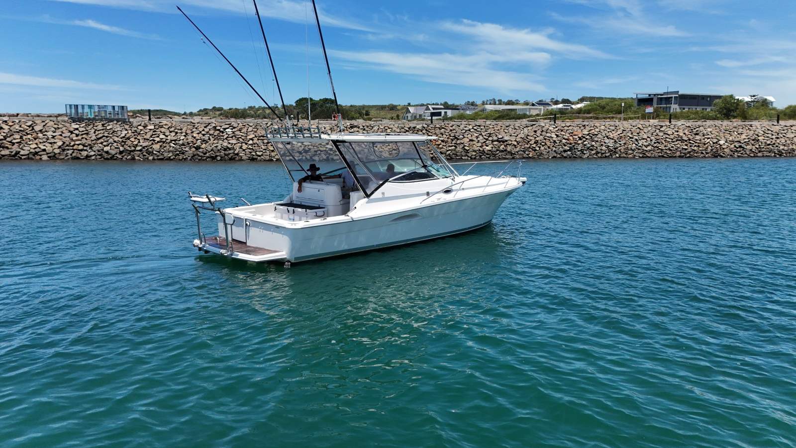 Fitted with a custom targa top and clears, this boat offers excellent protection while still maintaining a huge, functional cockpit. The Fusion stereo system delivers big sound, while the outriggers and serious fishing setup make this a genuine offshore weapon.
