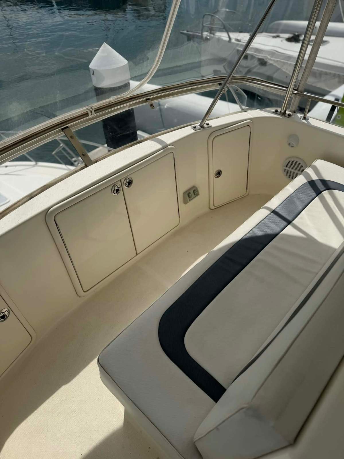 Flybridge helm station with excellent visibility and seating