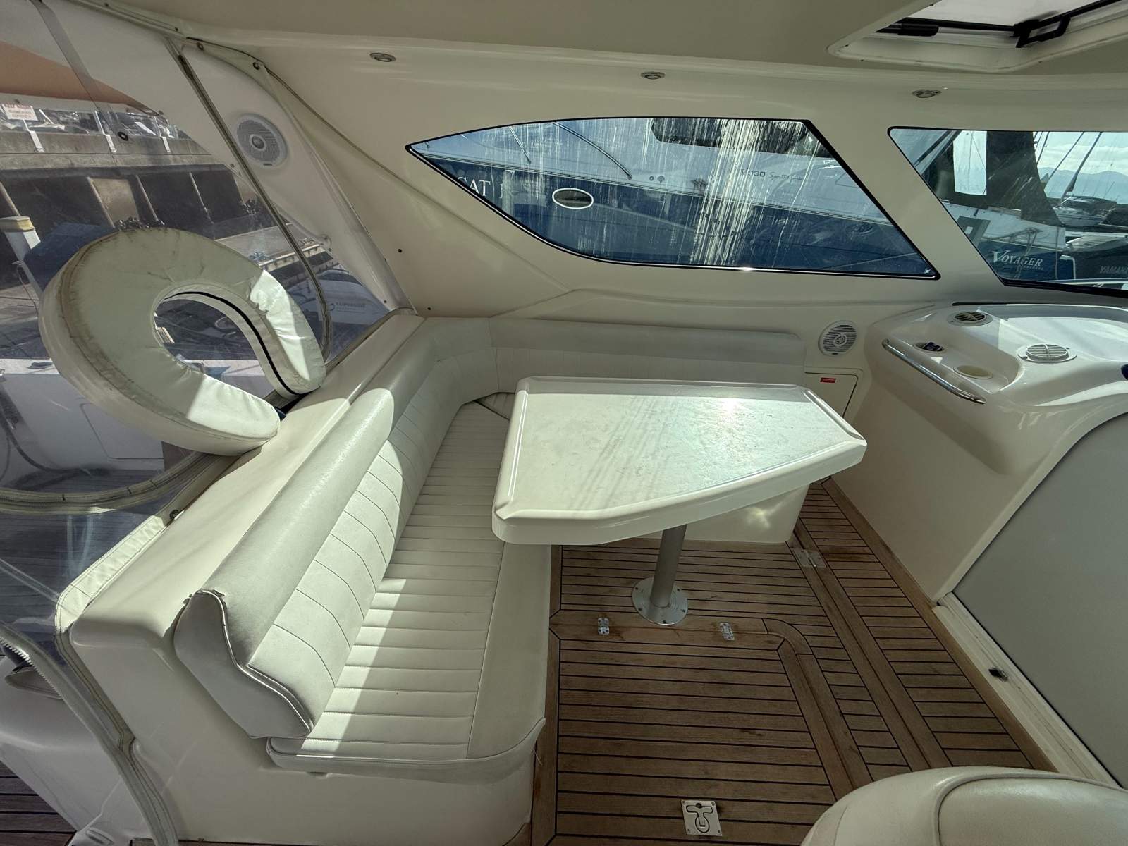 ** Spacious cockpit with lounge seating, integrated fridge, sink and shower.
