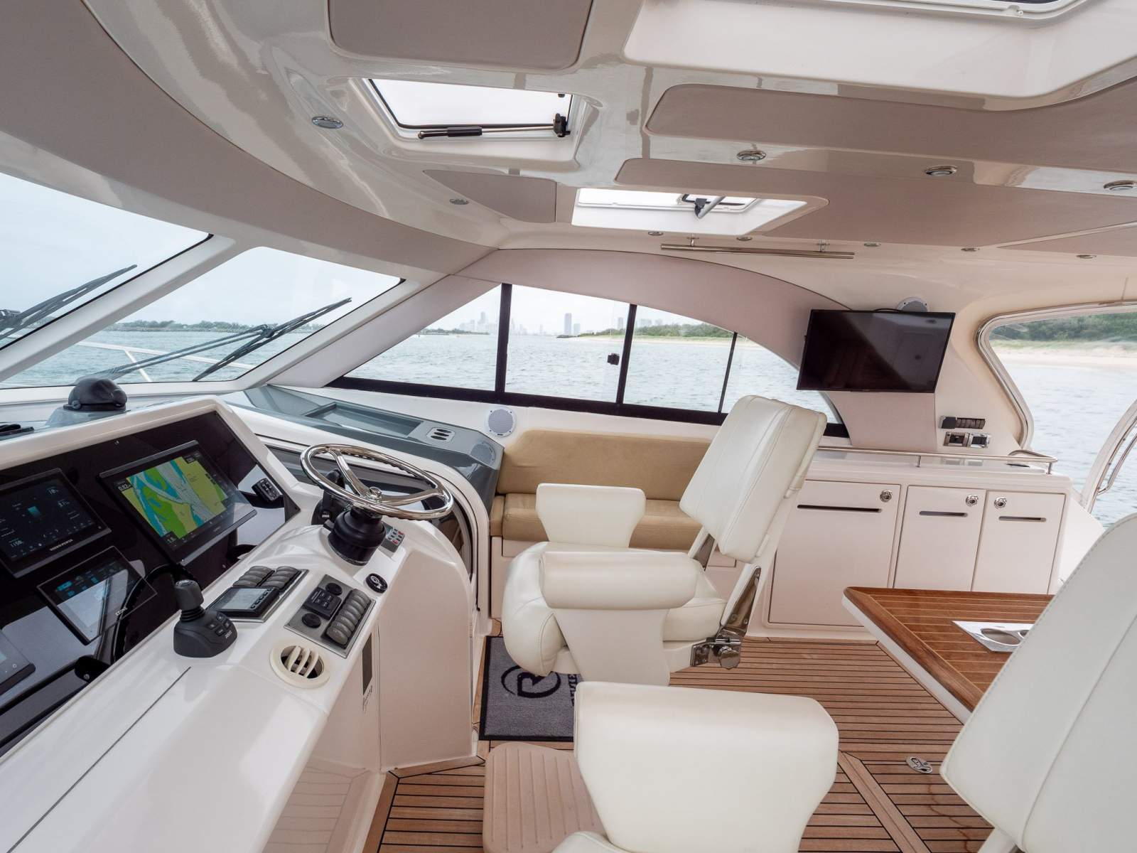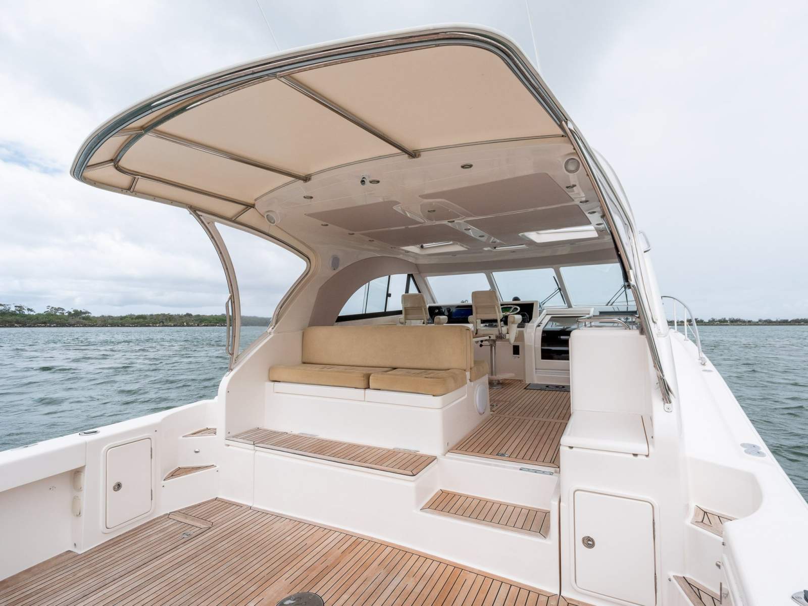 The expansive cockpit is purpose-built for offshore fishing and entertaining alike, featuring teak decking twin cockpit fridges, cool box, stainless steel anchor gear, and aft breezeway covers. Wide side decks and a deep foredeck provide safe, confident movement underway.