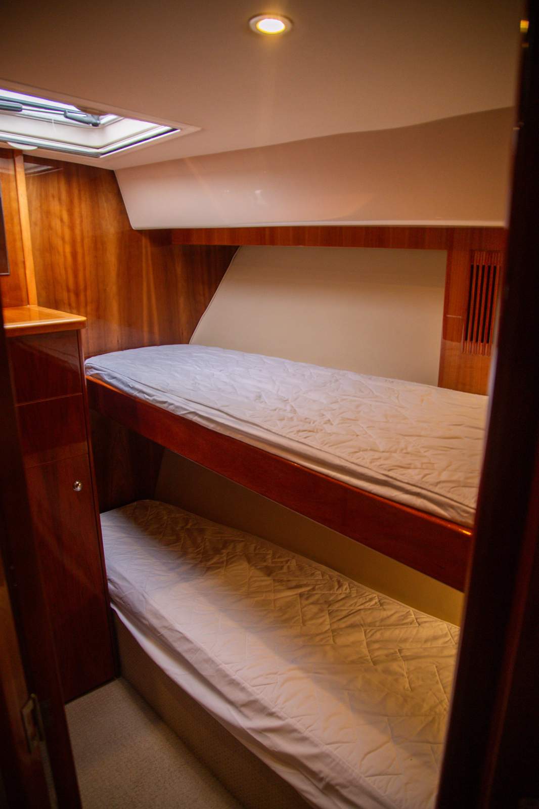 The forward accommodation space is luxuriously appointed with three cabins, sleeping 6 and two full heads. The forward master stateroom features a double berth with excellent walk-around access, plenty of storage and a private ensuite head to port. This ensuite features a vacu-flush toilet, large vanity and basin and a spacious separate shower stall. The VIP-guest cabin sits to port and features a twin single berth configuration with plenty of storage and further access to the under floor electrical/systems and storage compartment. Across to starboard is a second heads compartment, featuring a vacu-flush toilet, vanity and basin and a large separate shower stall. A third guest cabin sits just forward, featuring a twin bunk configuration, while a convertible double berth in the saloon completes the accommodation for 8.