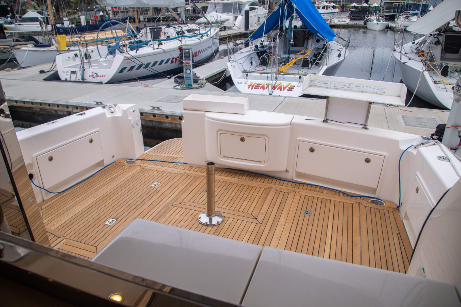 The saloon is wonderfully spacious with excellent vision out, providing a functional space for long-term stays or entertaining. A folding glass window to port of the main salon door is a unique feature to the 45 model and creates a fantastic feeling of alfresco style living, providing a better connection to the water and cockpit space. The saloon offers an abundance of seating with enough for at least 8 across two opposing L-shape settees, while a varnished timber dinette sits to starboard. Big Blue also features the rarely optioned footstool unit for added comfort. An upgraded Fusion sound system is controlled via a main head unit below the switch panel on the starboard side. The galley sits to port and features enormous, uncluttered Corian bench tops, 3 large fridge/freezer drawers, a dishwasher, large stainless teel sink, 2-burner electric cooktop and a convection microwave/oven. Below foot is a deep storage area and electrical/systems space.