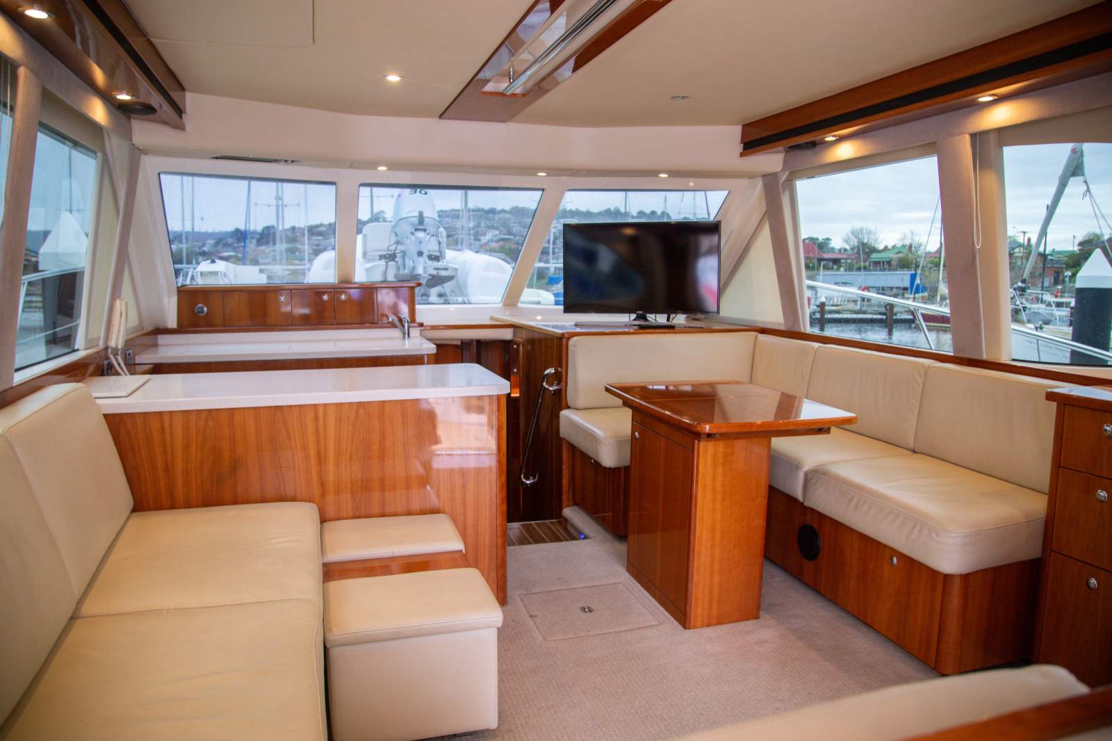 Up a set of moulded stairs is the large flybridge, wrapped in a set of Strata Glass and Vyback clears that present like new. The helm station is exceptionally well-equipped and feature a pair of Navigator full-back helm chairs. There is no shortage of electronics and equipment, featuring twin Raymarine Axiom touchscreen displays, integrated radar and autopilot, bow and stern thruster controls, a Muir windlass chain counter, remote spotlight and Caterpillar digital engine telemetry. A wireless Yacht Controller integrates both thrusters and the twin main engines for short-handed docking requirement. Accompanying the helm is a large lounge area forward with plenty of seating for 6 or so, plus a high-low dinette and infill, while a flybridge bar unit sits to starboard with a drinks fridge and sink.