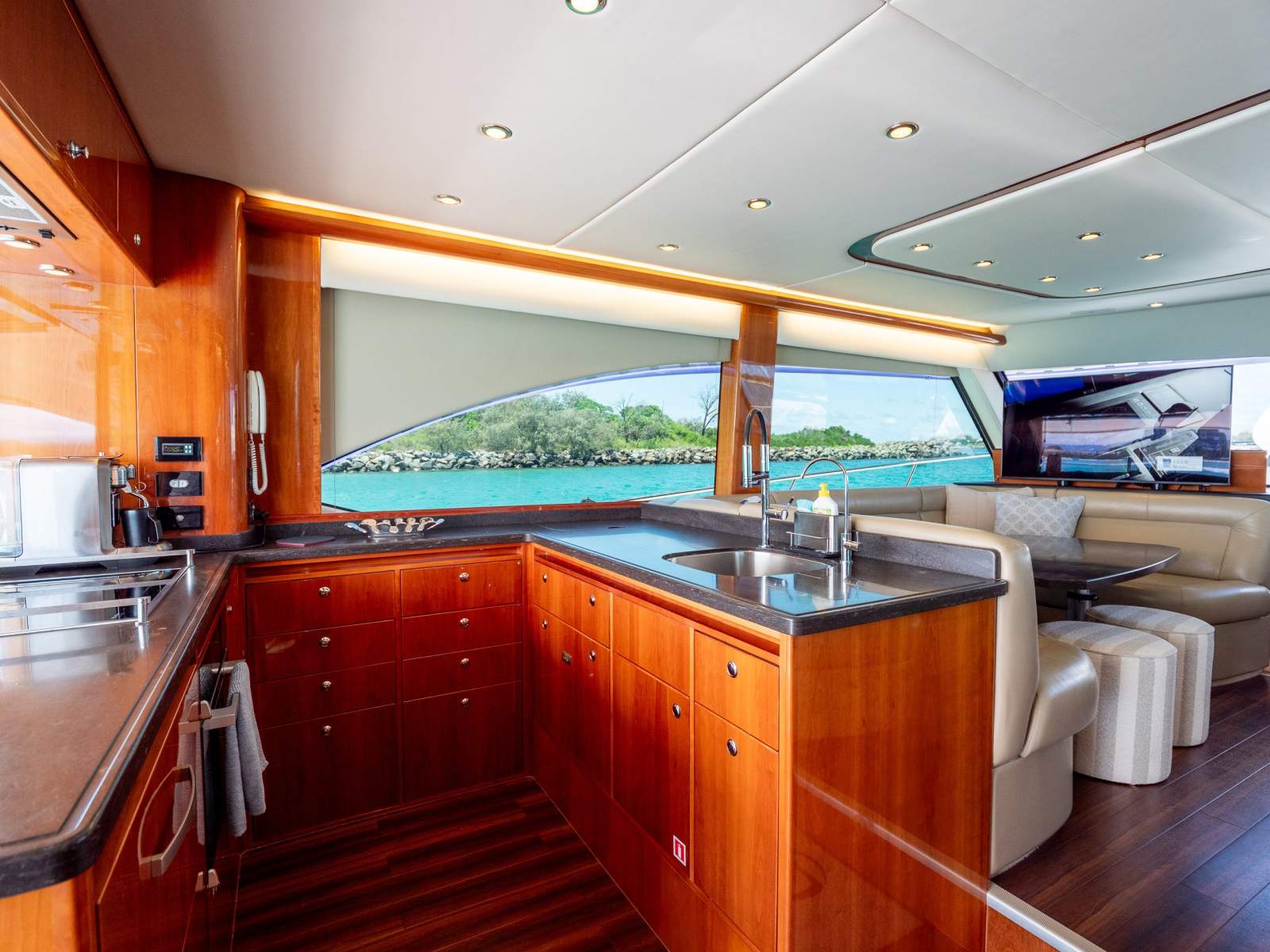 Inside, the saloon is light-filled and inviting, enhanced by new Smart TVs, Fusion sound system, Starlink, elegant furnishings, and Riviera's timeless fit and finish. The galley is exceptionally well-appointed with Miele induction cooktop, combi oven/microwave, dishwasher, onboard watermaker, garbage compactor, and 4 refrigeration units, making onboard living effortless for extended stays. A Miele washing machine and heat-pump dryer further support long-range cruising comfort.