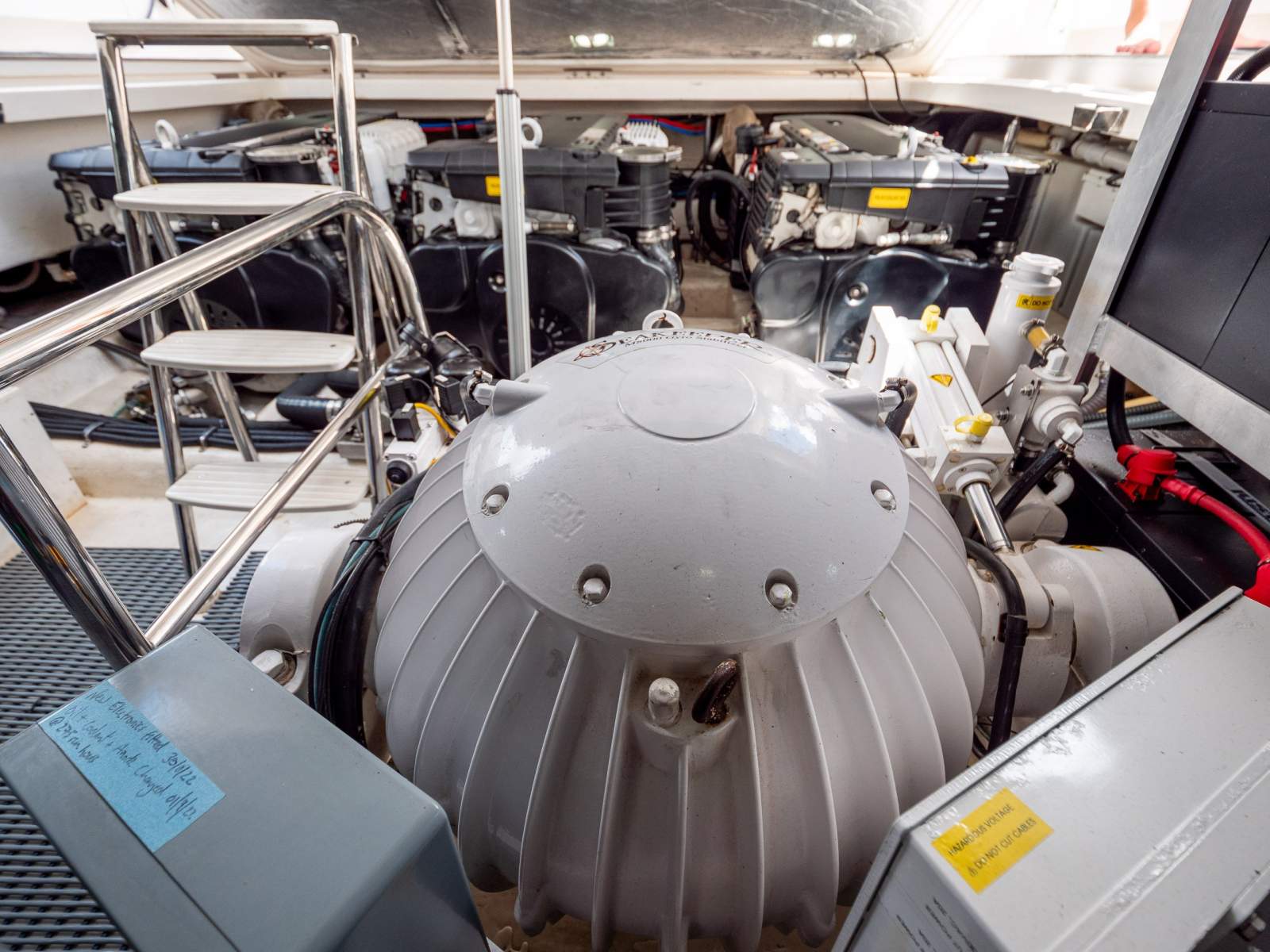 The aft cockpit and hydraulic swim platform are designed with practicality and enjoyment in mind. An extended rear awning, pressure washer, bait board, and swim platform rails make this area ideal for entertaining, fishing, or watersports. The Foredeck features a stainless steel davit crane, life raft & 5-seat Grand tender with Yamaha 30hp four-stroke providing easy access to shore and exploration at anchor.