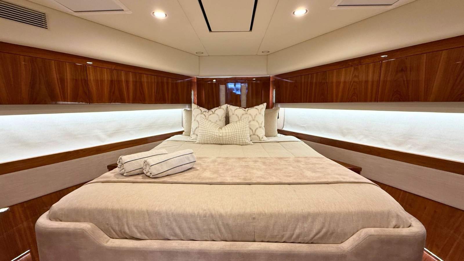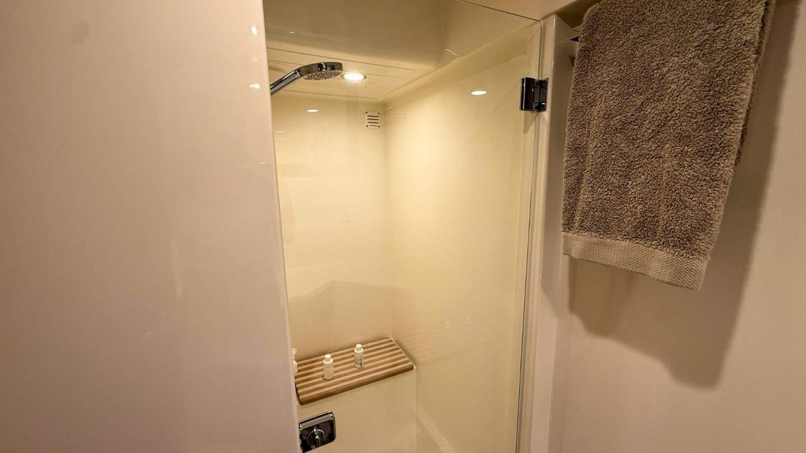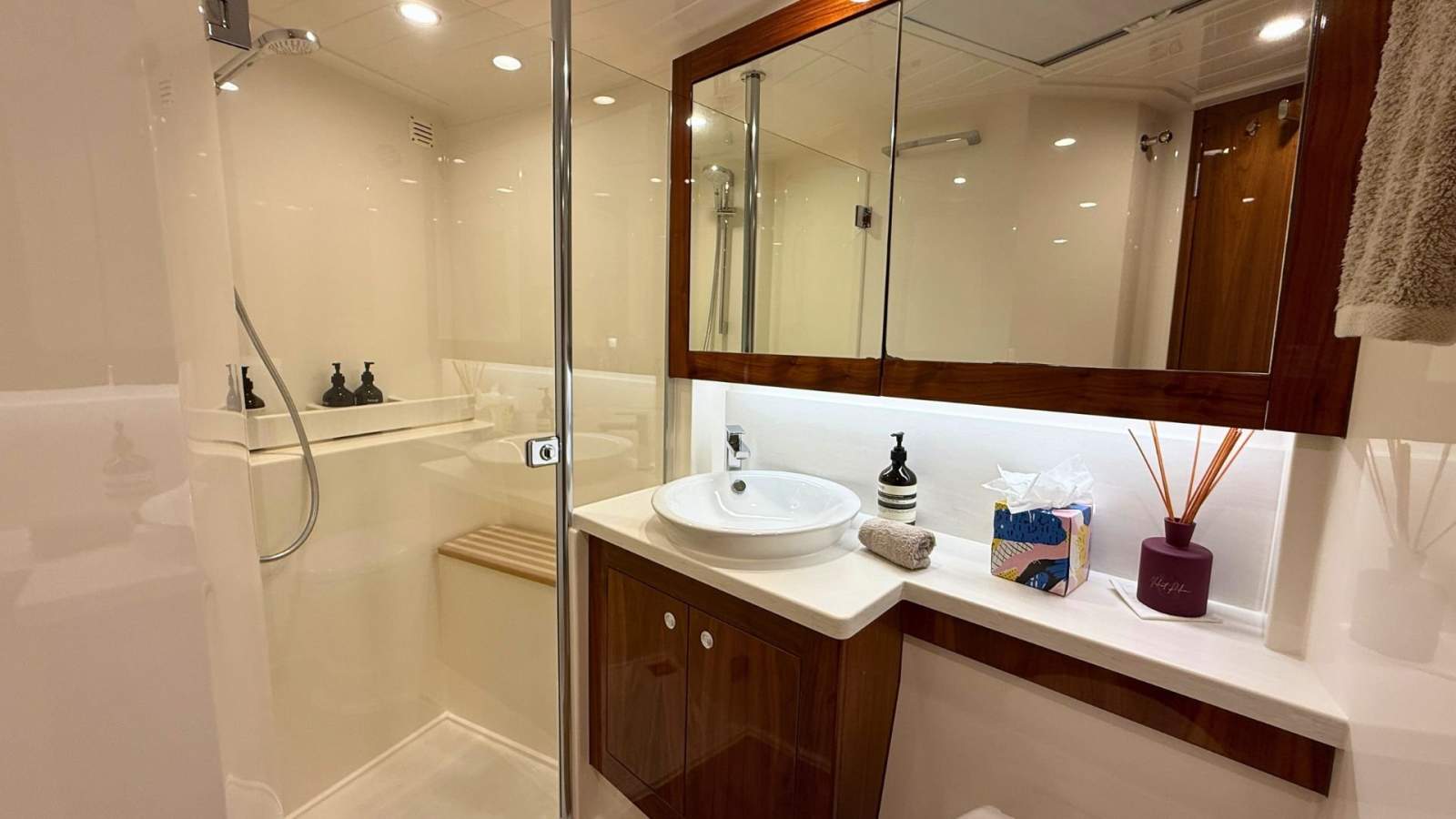 Performance is driven by Volvo IPS propulsion, delivering efficiency, manoeuvrability and a notably smooth ride. Air intakes with mist eliminators and a forced air extraction system support mechanical longevity, while the SeaKeeper gyro stabiliser significantly enhances onboard comfort both underway and at rest.