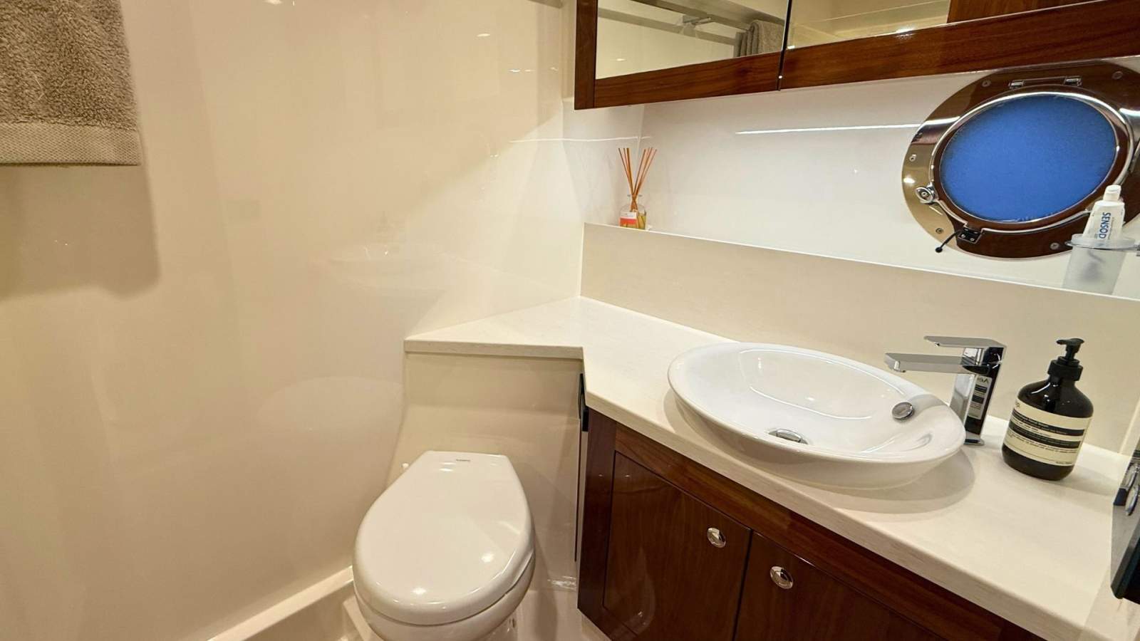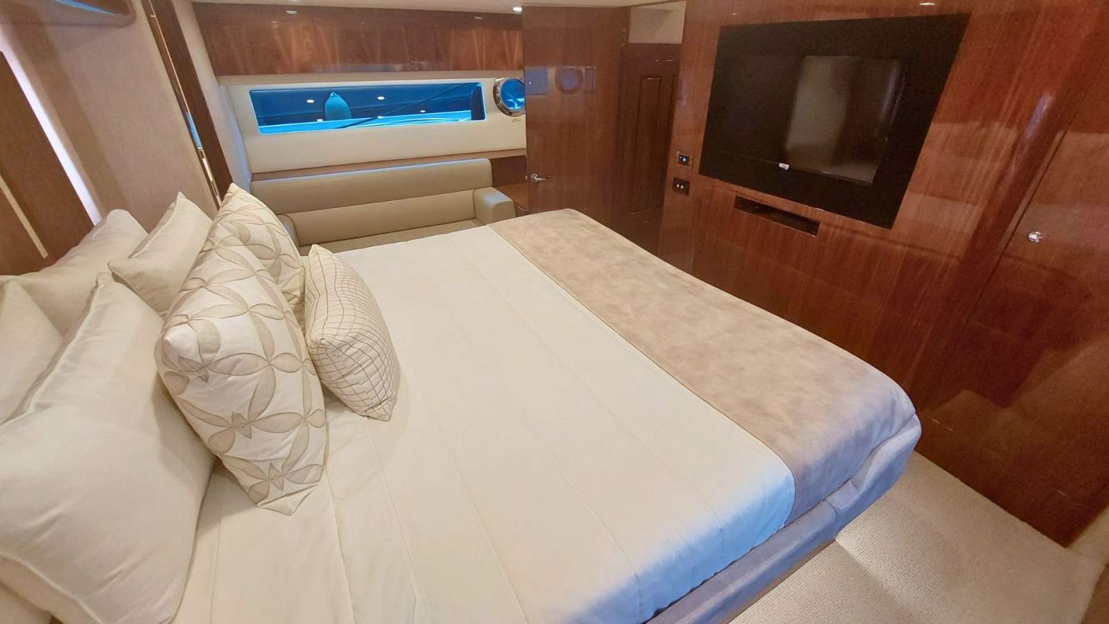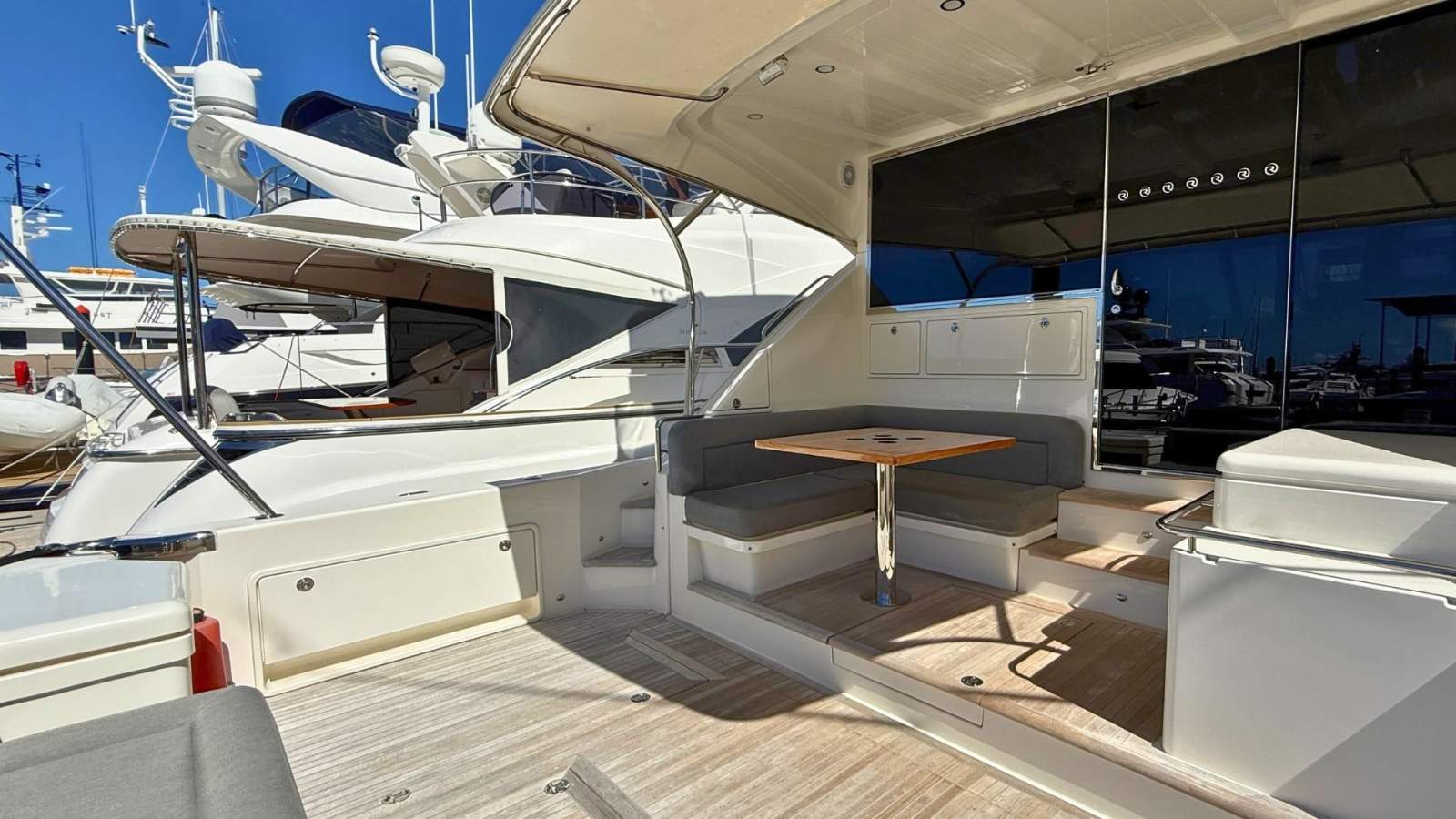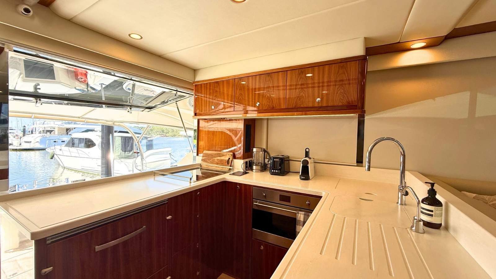 Performance is driven by Volvo IPS propulsion, delivering efficiency, manoeuvrability and a notably smooth ride. Air intakes with mist eliminators and a forced air extraction system support mechanical longevity, while the SeaKeeper gyro stabiliser significantly enhances onboard comfort both underway and at rest.