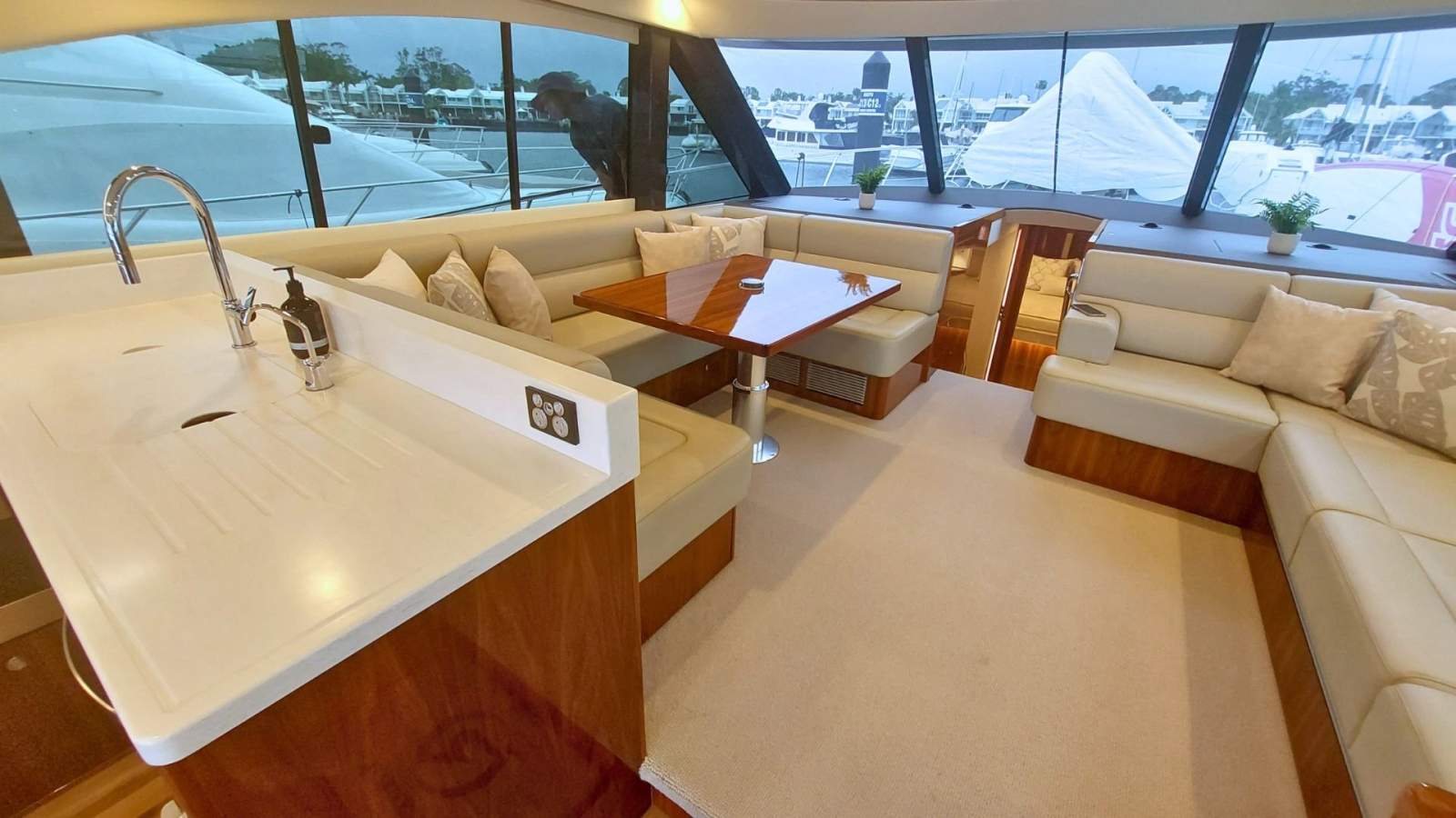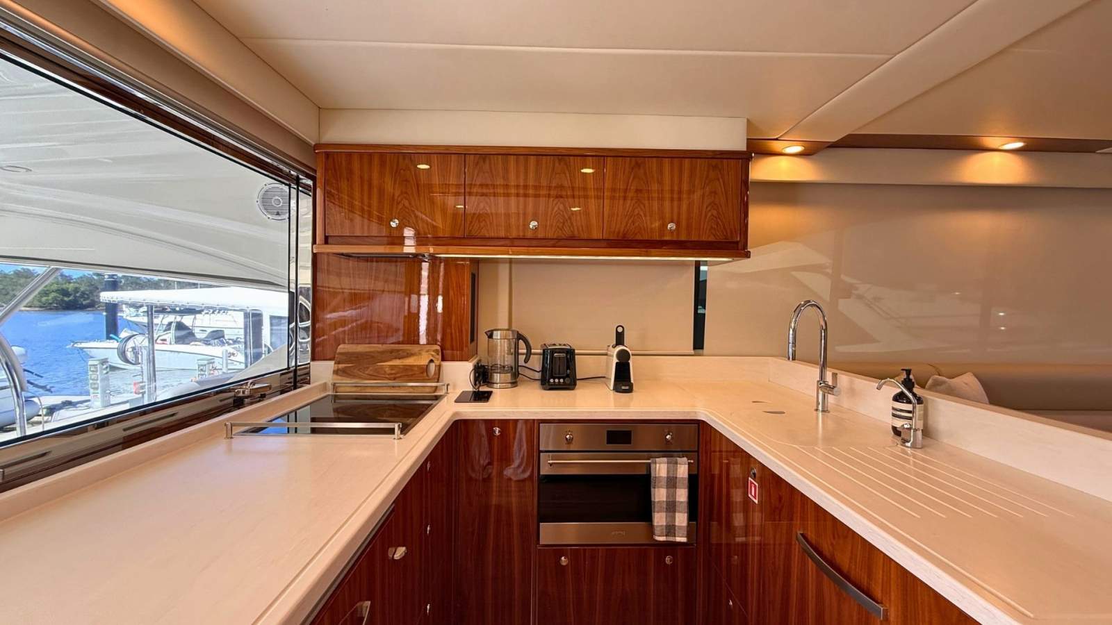 Internally, the finish is unmistakably Riviera: hand-finished timber cabinetry, premium leather upholstery and concealed lighting throughout. Climate control is extensive, with 30,000BTU and 36,000BTU units supplemented by two additional 16,000BTU systems, ensuring consistent comfort across the saloon, accommodation and flybridge.