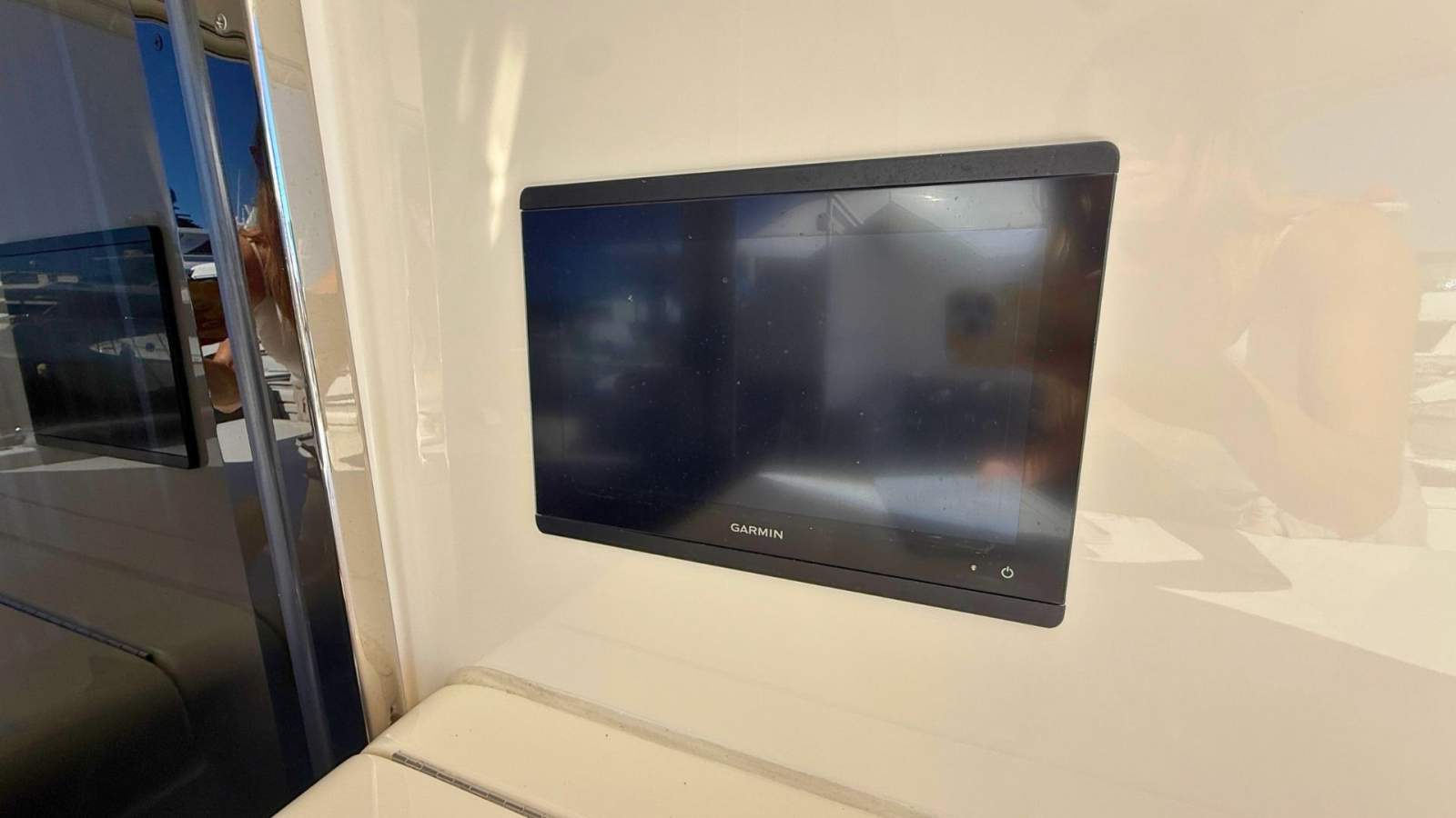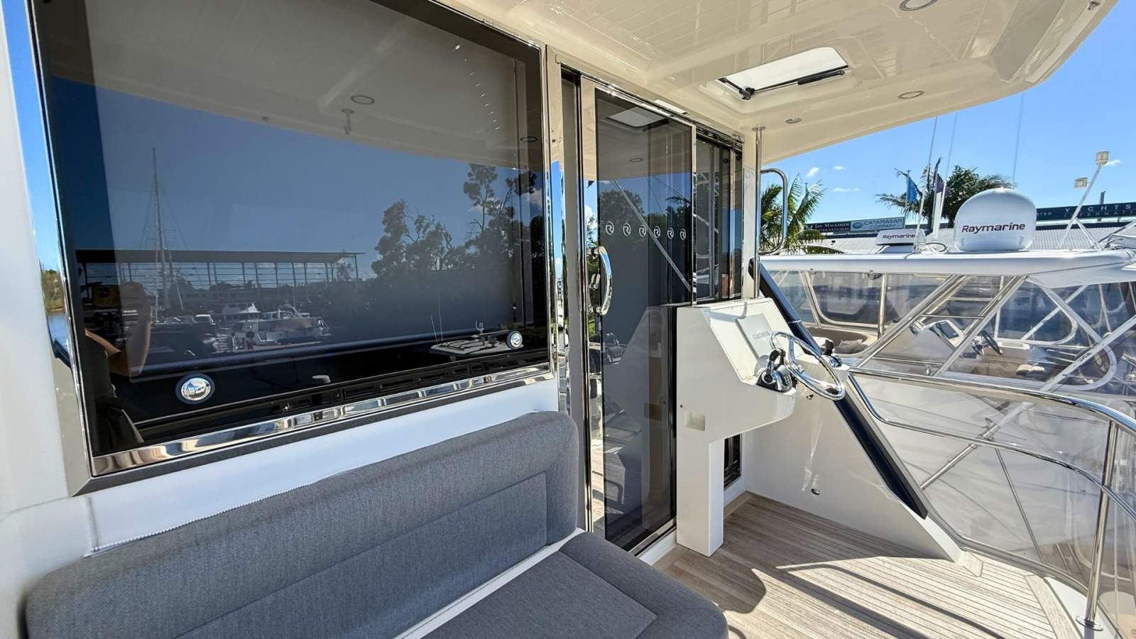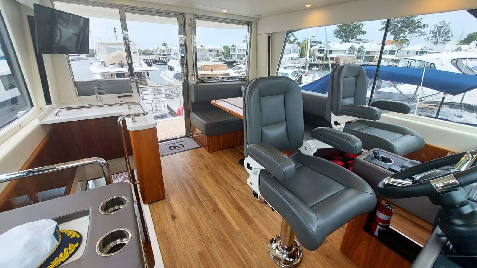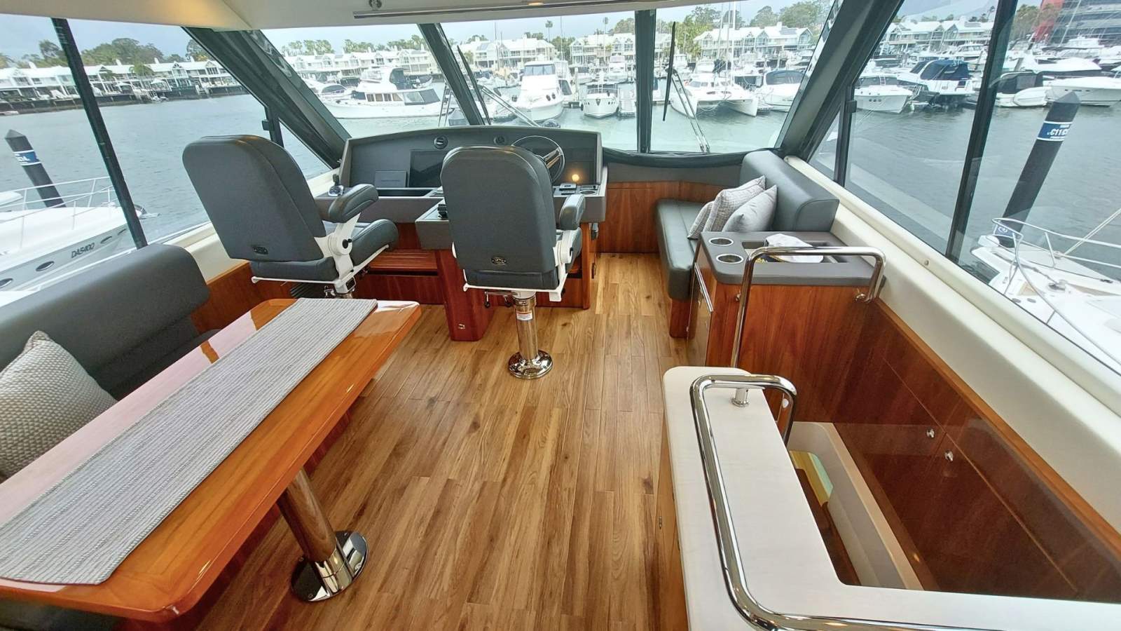 The enclosed flybridge is a defining feature of this model and a key reason for its continued demand. Fully air-conditioned and accessed via an internal staircase, it delivers true all-weather capability with outstanding visibility. An electric sunroof introduces natural ventilation when desired, while a complete Garmin and Volvo-integrated helm package provides confident command. Triple 17" Garmin MFDs sit at the main helm, supported by additional Garmin displays to the cockpit and aft flybridge. Volvo engine monitoring, integrated autopilot, IPS electric progressive steering with Trim Assist and triple joystick docking stations ensure precise handling in all conditions. Radar, transducer, chain counter, SeaKeeper gyro control, C-Zone digital switching and full communication systems complete a helm specification designed for serious cruising.