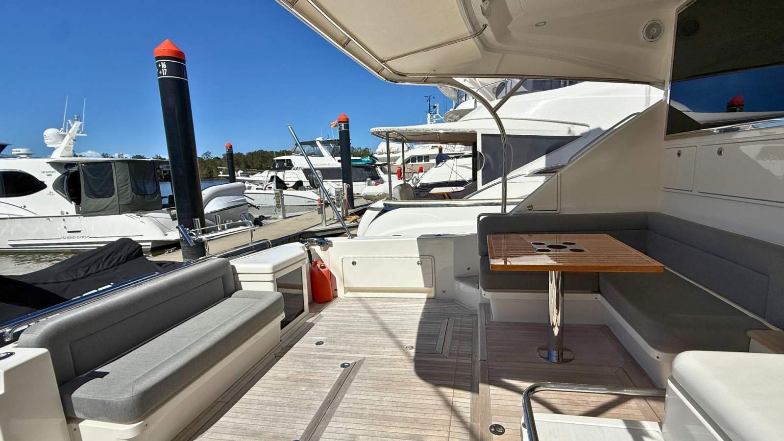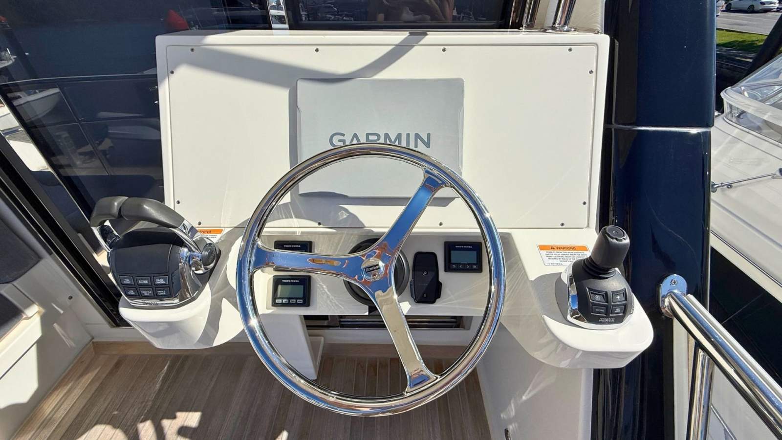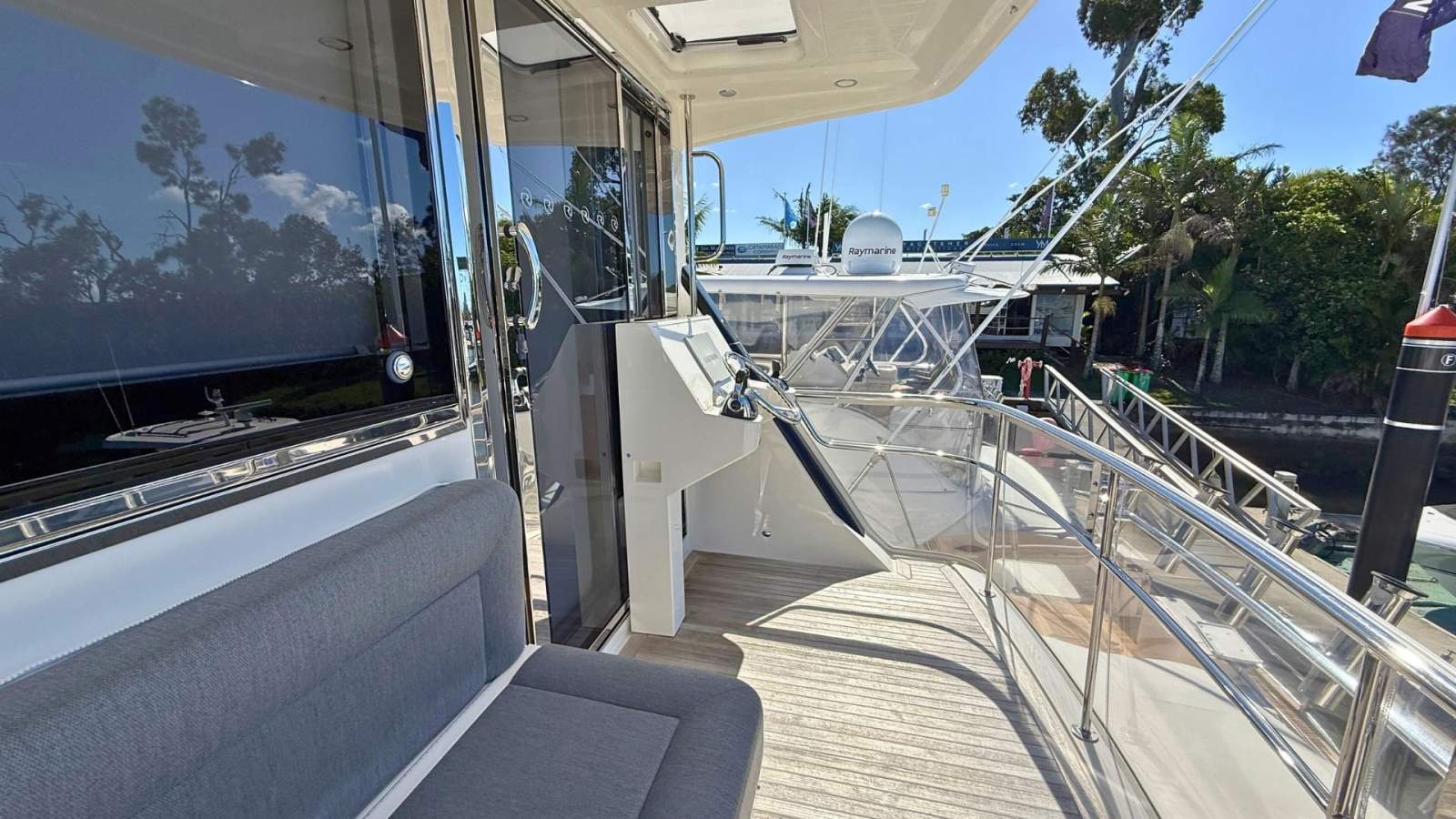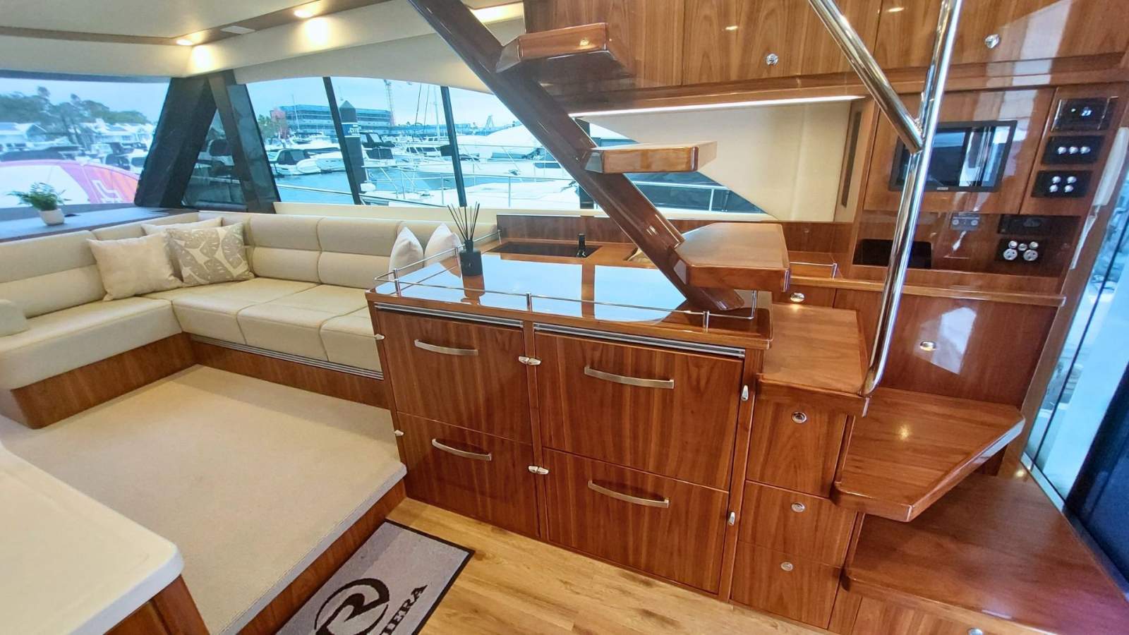 The enclosed flybridge is a defining feature of this model and a key reason for its continued demand. Fully air-conditioned and accessed via an internal staircase, it delivers true all-weather capability with outstanding visibility. An electric sunroof introduces natural ventilation when desired, while a complete Garmin and Volvo-integrated helm package provides confident command. Triple 17" Garmin MFDs sit at the main helm, supported by additional Garmin displays to the cockpit and aft flybridge. Volvo engine monitoring, integrated autopilot, IPS electric progressive steering with Trim Assist and triple joystick docking stations ensure precise handling in all conditions. Radar, transducer, chain counter, SeaKeeper gyro control, C-Zone digital switching and full communication systems complete a helm specification designed for serious cruising.