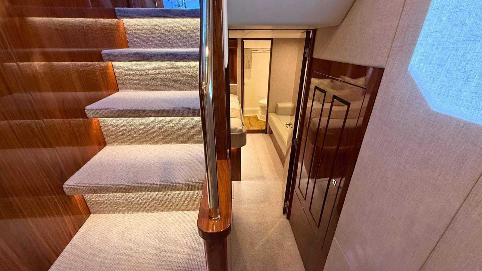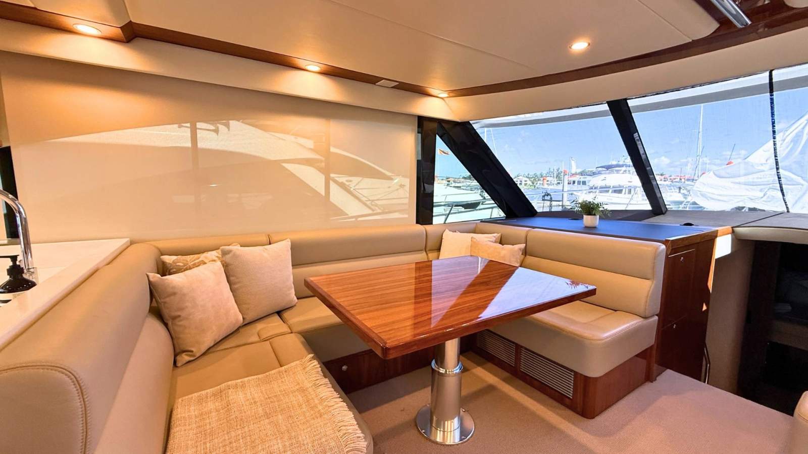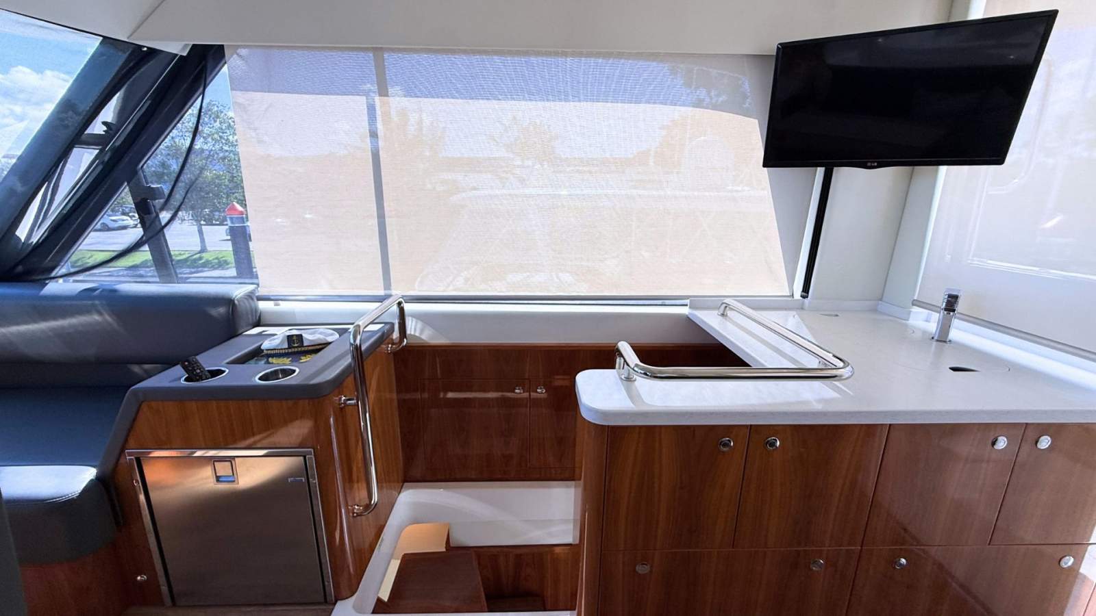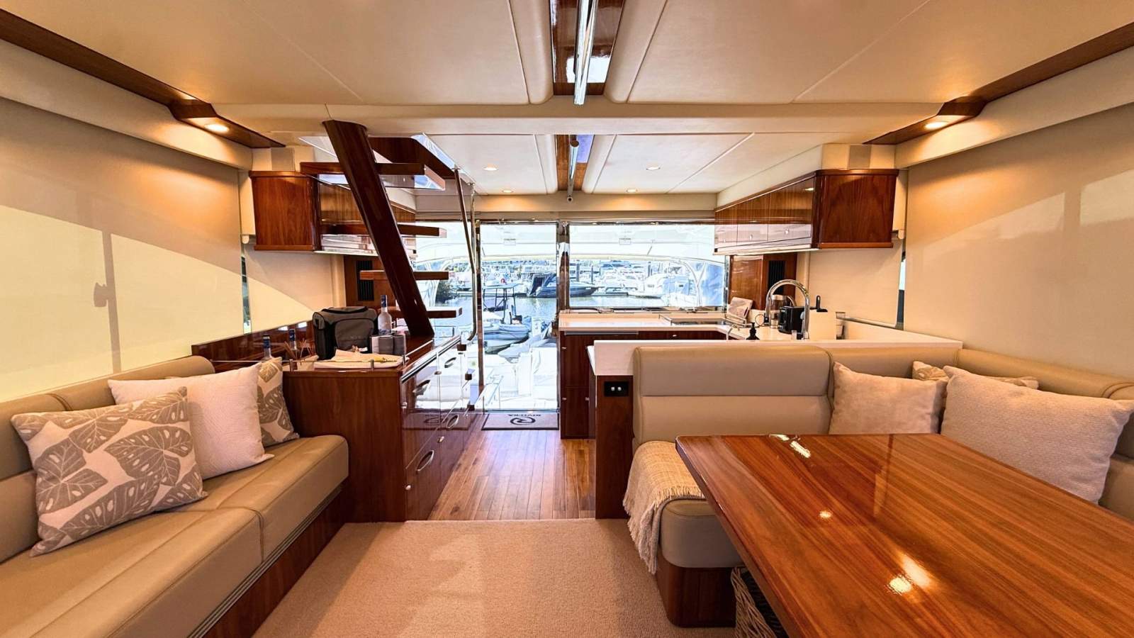 The enclosed flybridge is a defining feature of this model and a key reason for its continued demand. Fully air-conditioned and accessed via an internal staircase, it delivers true all-weather capability with outstanding visibility. An electric sunroof introduces natural ventilation when desired, while a complete Garmin and Volvo-integrated helm package provides confident command. Triple 17" Garmin MFDs sit at the main helm, supported by additional Garmin displays to the cockpit and aft flybridge. Volvo engine monitoring, integrated autopilot, IPS electric progressive steering with Trim Assist and triple joystick docking stations ensure precise handling in all conditions. Radar, transducer, chain counter, SeaKeeper gyro control, C-Zone digital switching and full communication systems complete a helm specification designed for serious cruising.