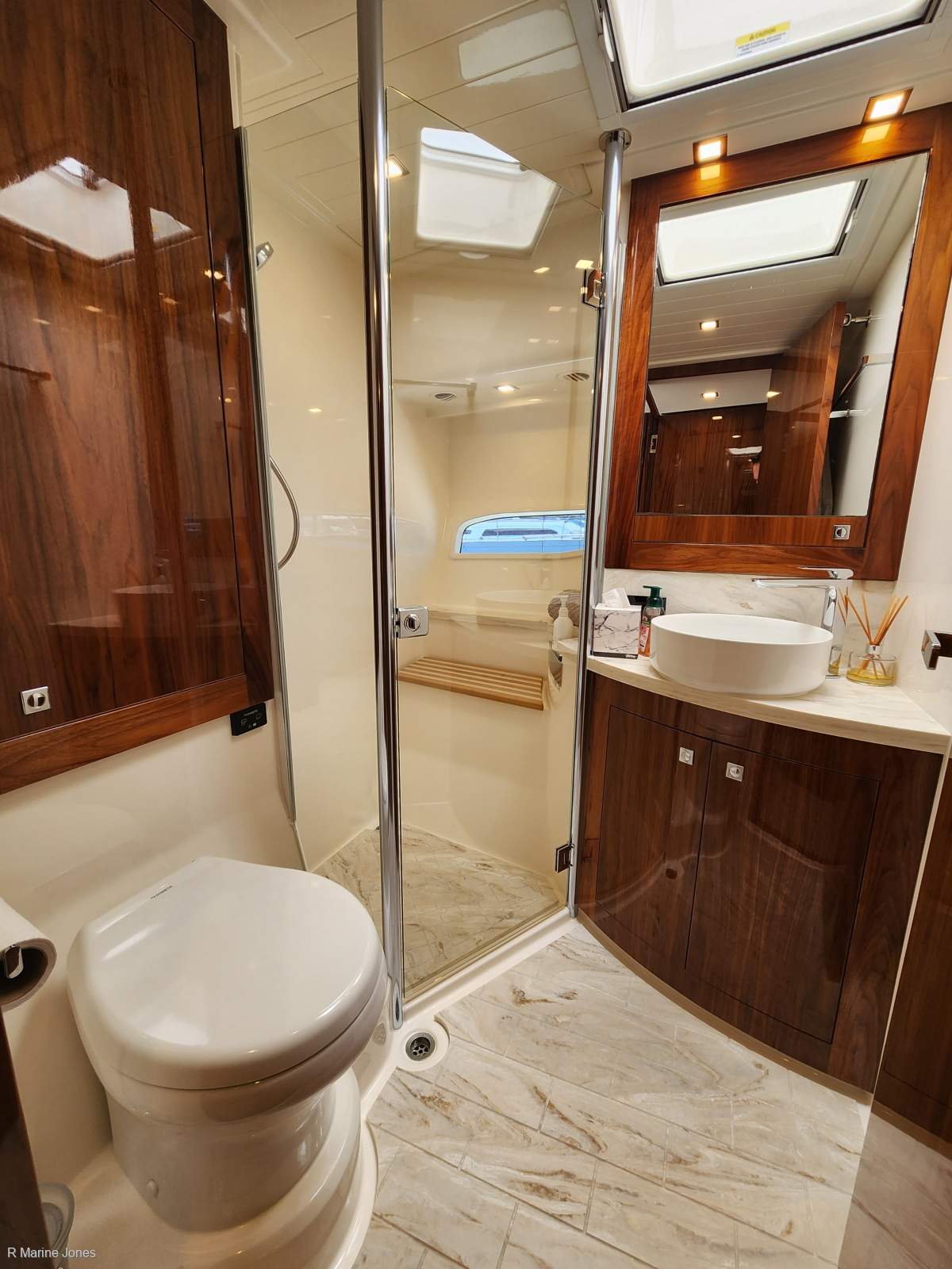 3 Spacious cabins with lower lounge, 1 x full width Master cabin including ensuite, 1 x VIP guest cabin fwd with ensuite, 1 x twin singles with ensuite. Stbd master cabin hull window fitted with electric blind