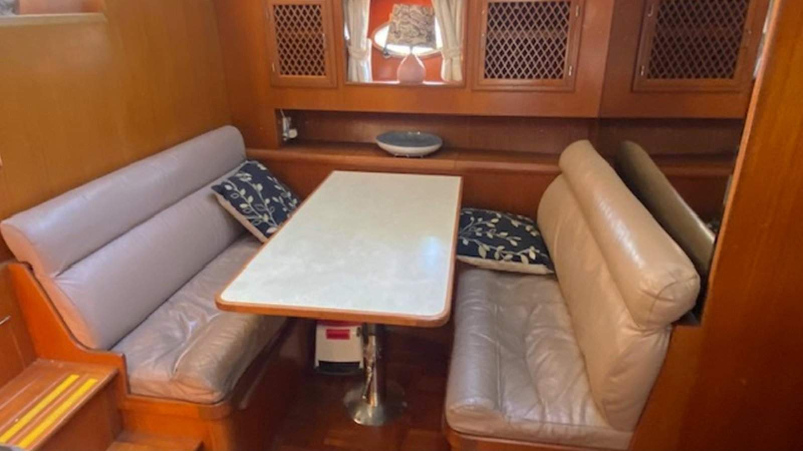 > A king-size master aft cabin with a generous ensuite and separate full shower, while the forward VIP queen-size cabin has private access to the second ensuite. Additionally, the breakfast table converts into a berth for visitors.