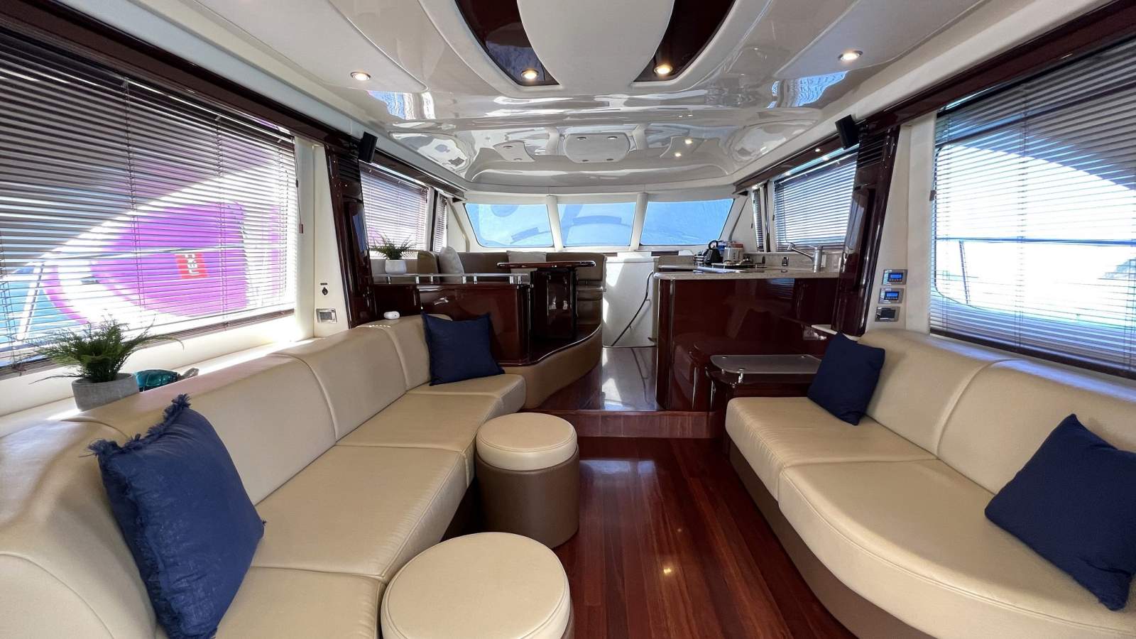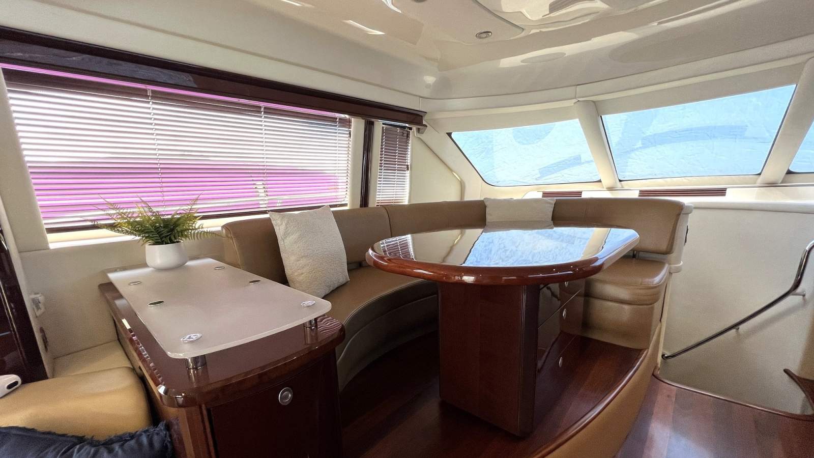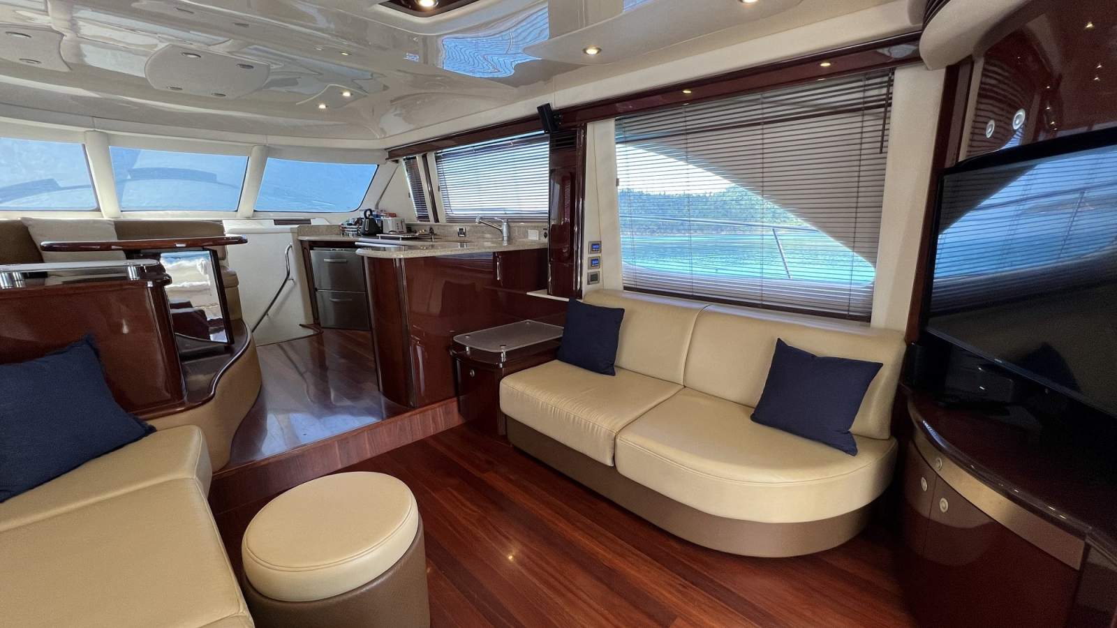 Inside, the yacht showcases Sea Ray's signature high-gloss Cherry wood interior, creating a warm and luxurious atmosphere throughout the spacious saloon, open-plan galley and dinette.