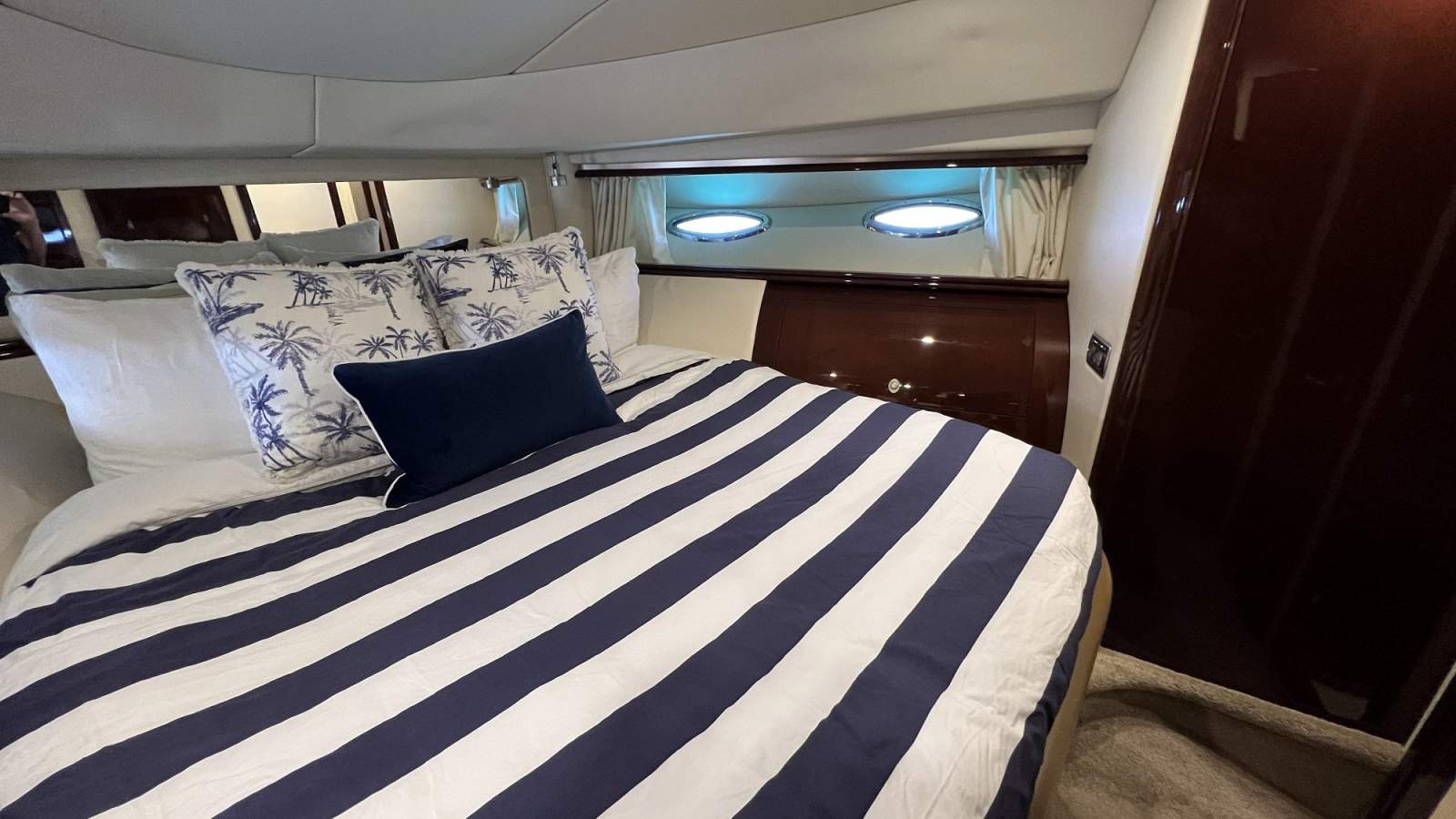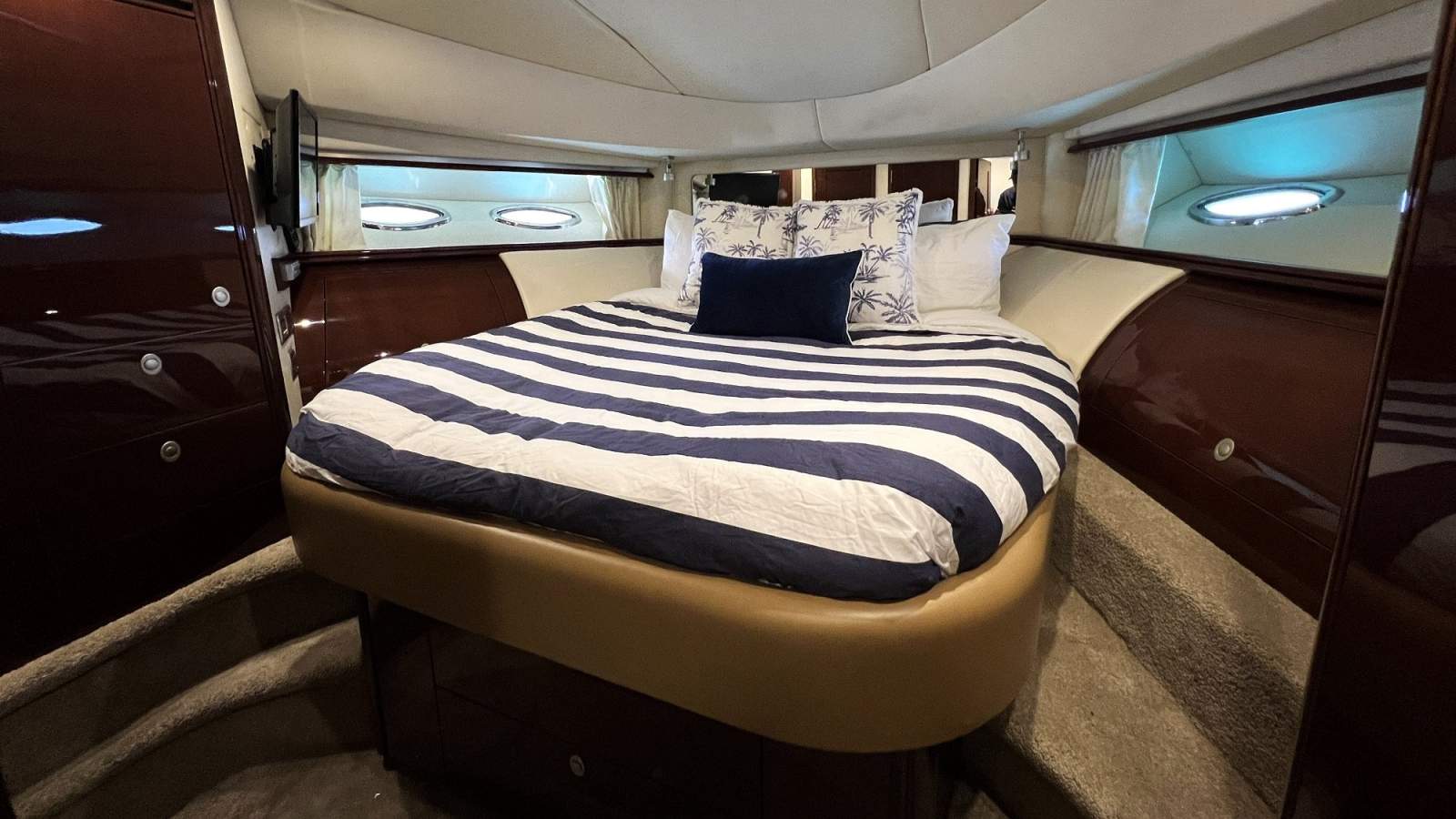 Accommodations cater for up to 6 overnight, comprising a full beam master stateroom with ensuite, guest VIP stateroom forward with two way bathroom, plus a twin bunk cabin starboard.