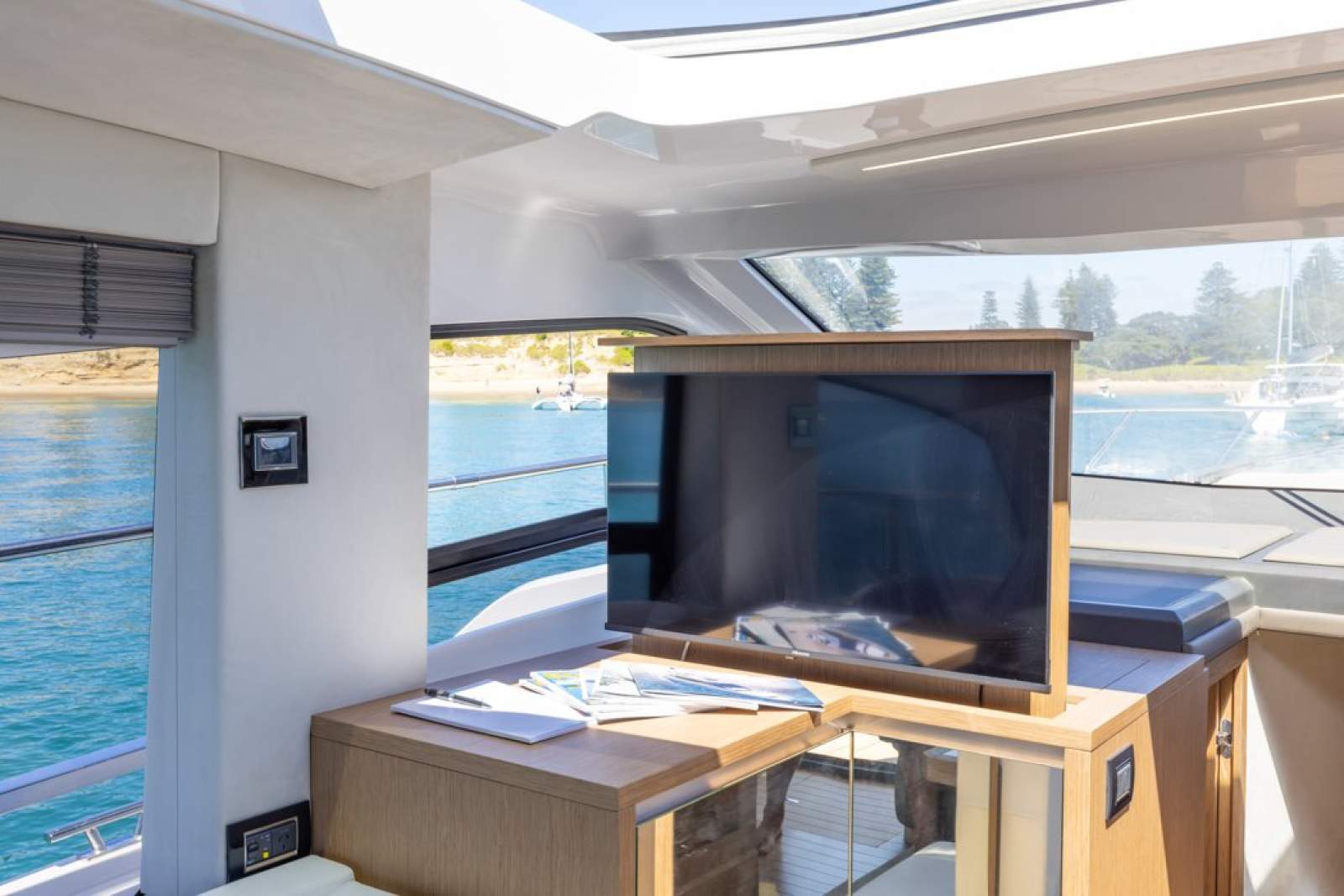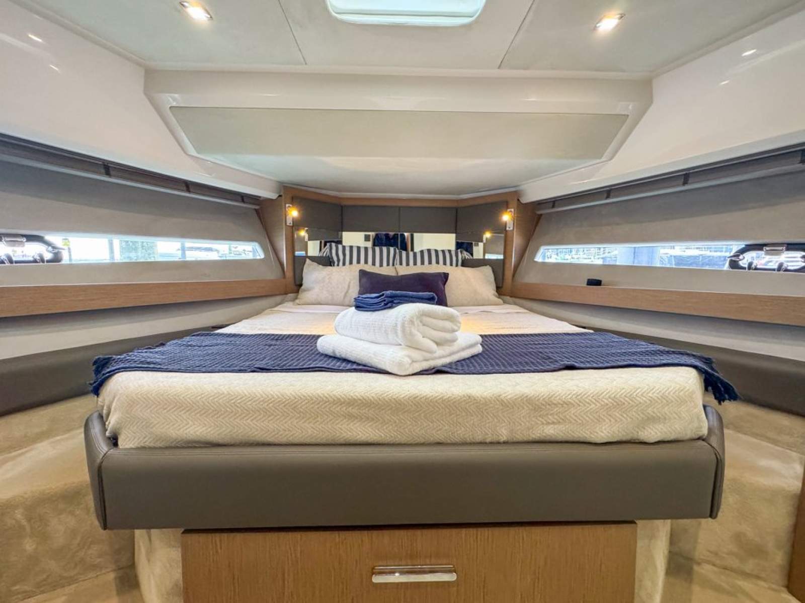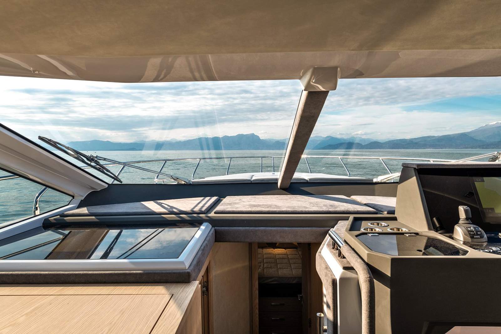 Performance matches the luxury. The upgraded twin Volvo D6 IPS650 engines (480hp each) provide smooth, quiet cruising at 27 knots and speeds up to 36 knots, with joystick control and a separate bow thruster ensuring stress-free manoeuvring. A full Garmin electronics suite with twin 12" displays completes the helm.