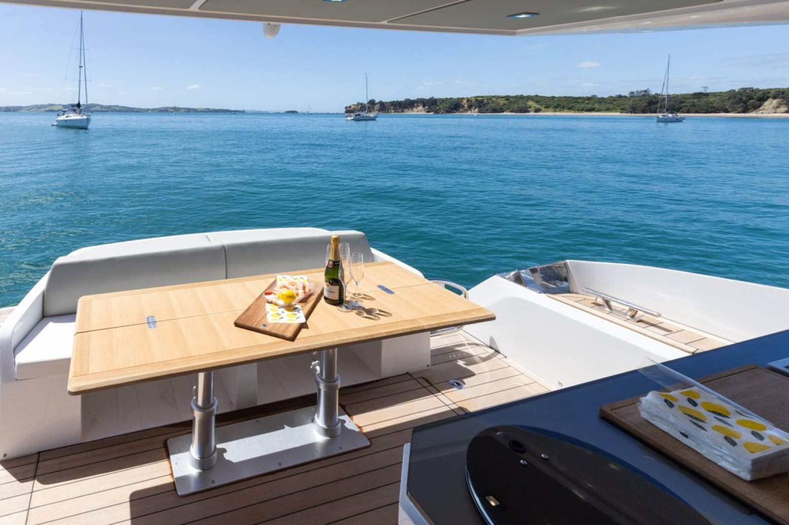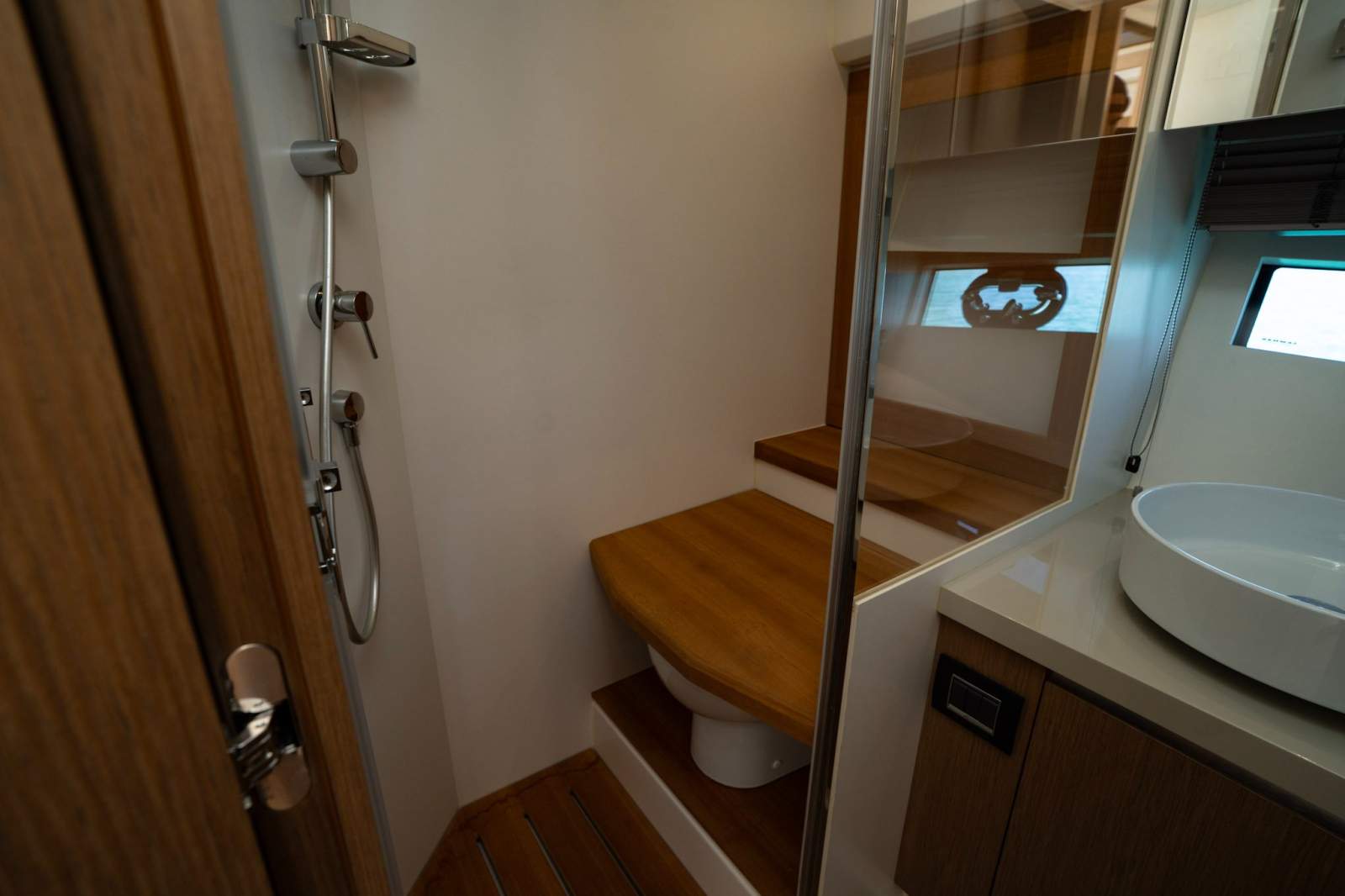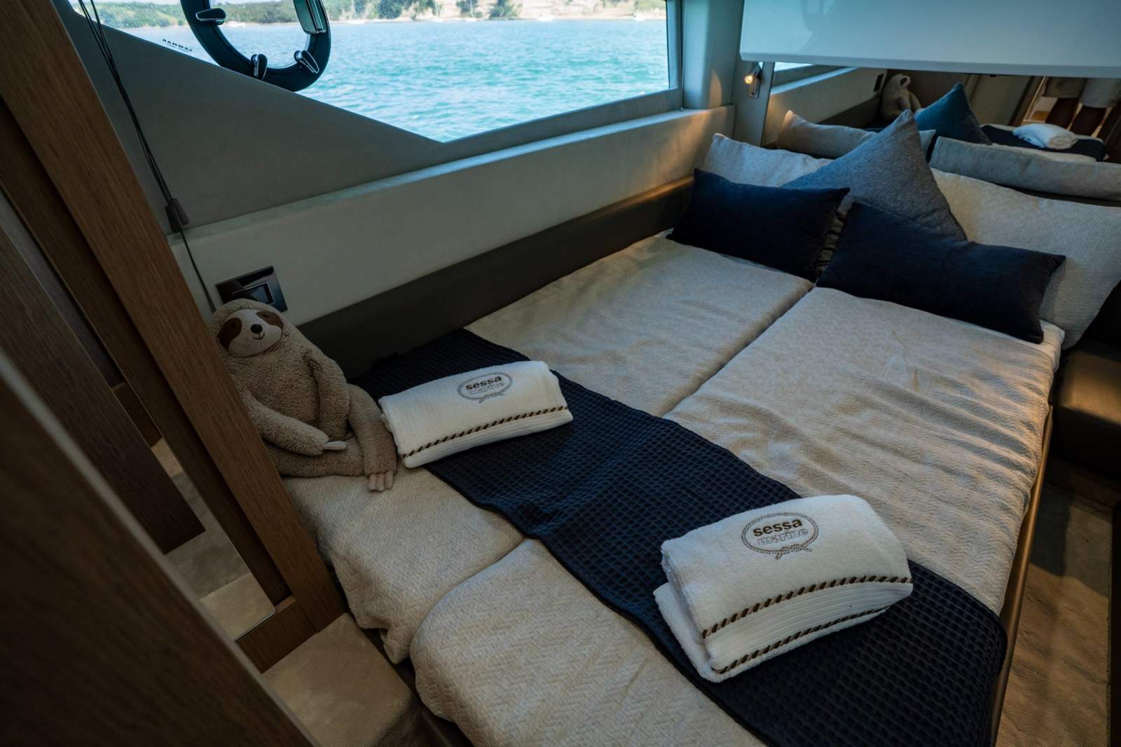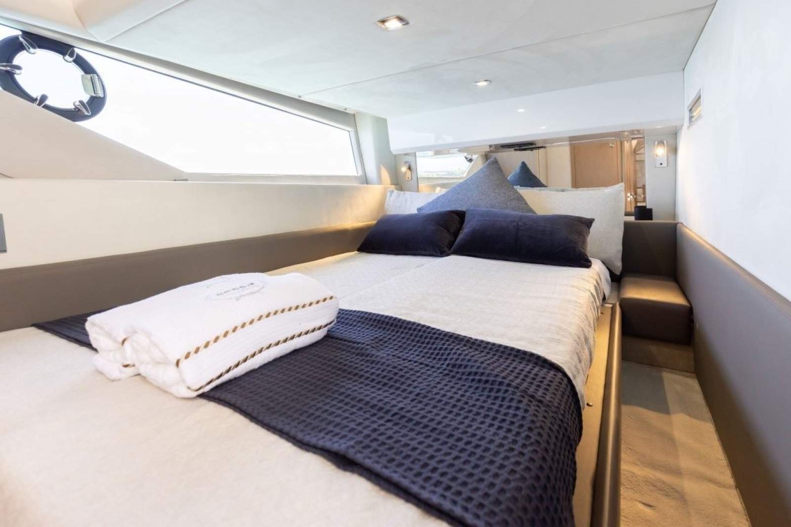 Below deck, accommodation is generous and thoughtfully designed. A full-beam master suite with private ensuite delivers true owner comfort, while two additional guest cabins feature convertible berths, offering flexible configuration for family or visitors. The finish throughout is modern, elegant and unmistakably European.