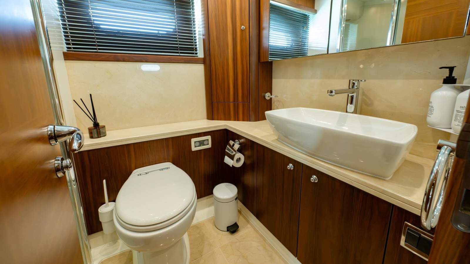 Stepping aboard, the saloon immediately impresses with its inviting atmosphere, ample headroom, and large windows that frame the surrounding views while flooding the interior with natural light. The layout is designed for comfort and flexibility, offering seamless flow between lounging, dining, and helm spaces. Below deck, accommodation for up to eight guests plus crew is thoughtfully arranged, featuring a full beam midship master stateroom, a forward VIP, a starboard double, bunk cabin, day head, laundry, and a separate crew cabin accessed via the swim platform.