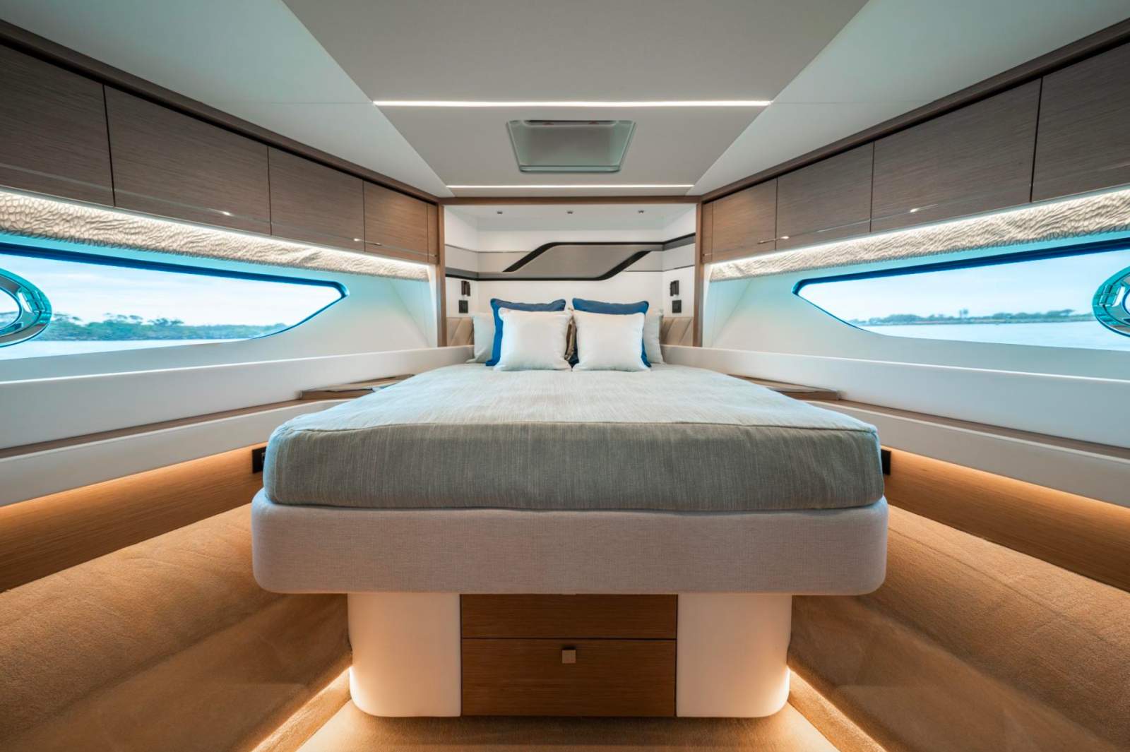 Aesthetic styling is prevalent in every detail. The yacht profile turns heads with stainless steel air intake cowlings and exterior handrails, contributing to the high-quality finish. There is an enhanced material selection, with new exterior upholstery and moulding options. Adventurous buyers will be captivated by a choice of four new grey hull colours. Overall, the exterior is aggressive and imposing, with a new, angular hull and superstructure glazing design.