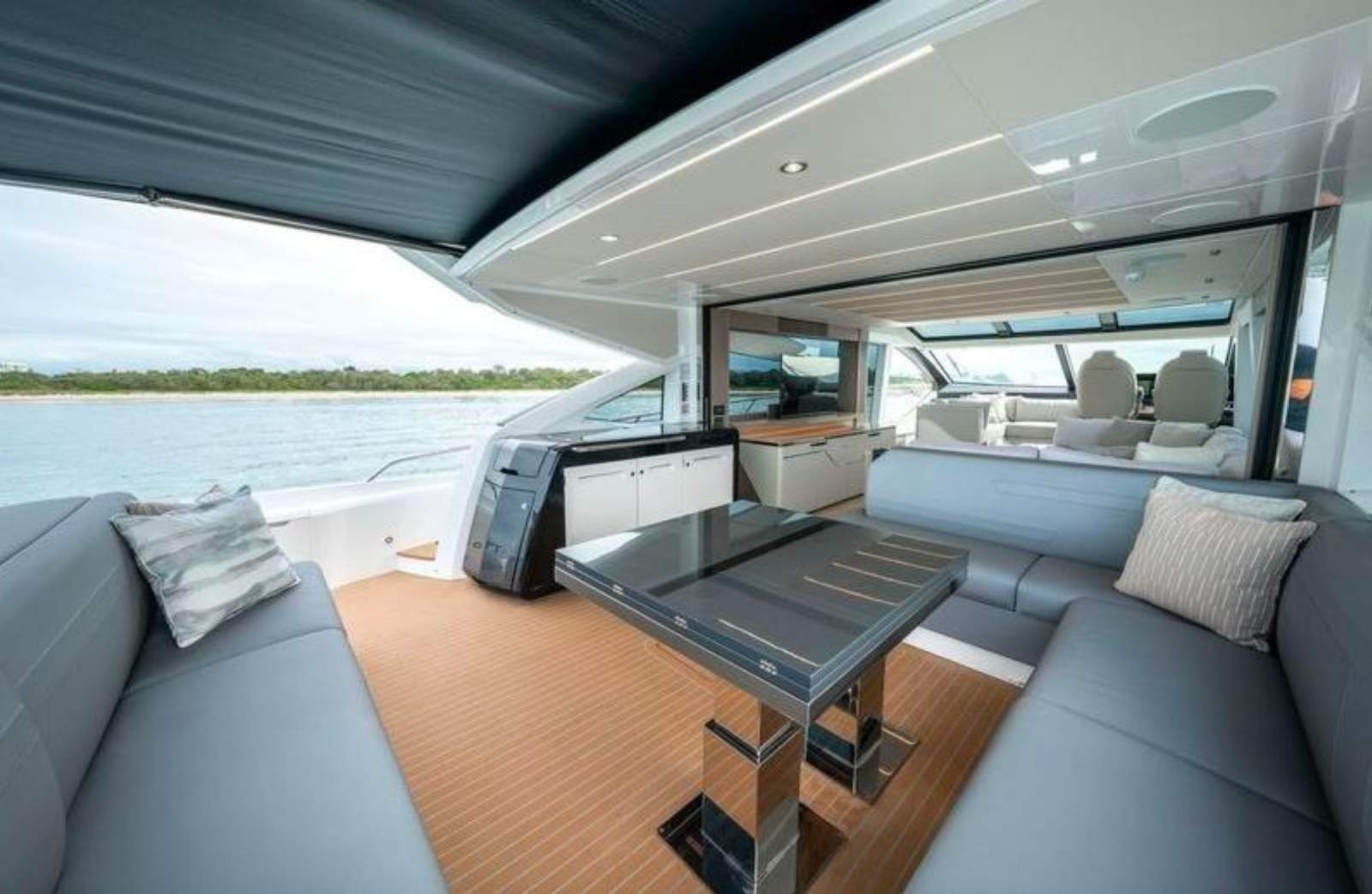 The aft cockpit benefits from a classic seating arrangement. Popular U-shaped seating with a rise-and-fall carbon fibre table provides an intimate social area. The aft sunpad is an ideal sunbathing space, with a large storage compartment concealed underneath. The cockpit door slides to starboard and then the door and window descend beneath the seating, uniting the cockpit with the saloon.
