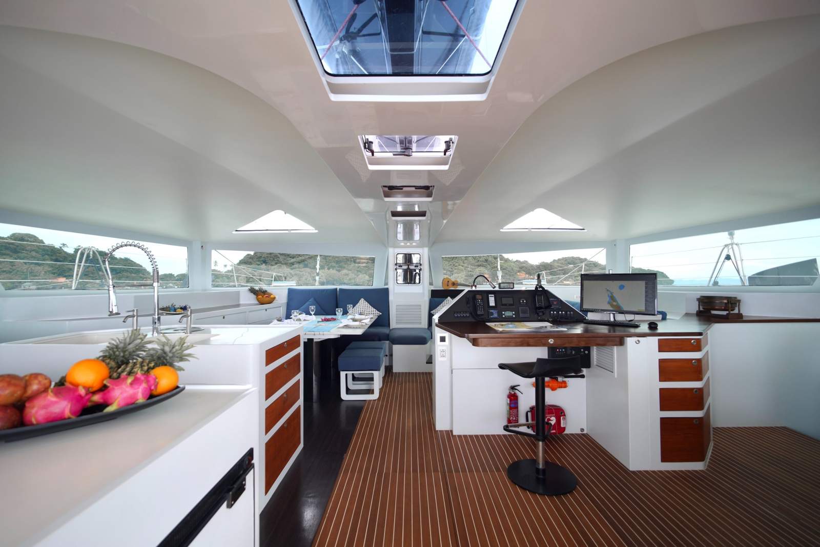 Four guest cabins sleep eight; three shower rooms. Galley is properly equipped - Siemens induction cooker, Miele oven, three refrigerators and generous storage. Her saloon is bright with 360-degree views and functional dining. Twin 75-hp Yanmar engines cruise at 8 knots, 10 L/h burn.