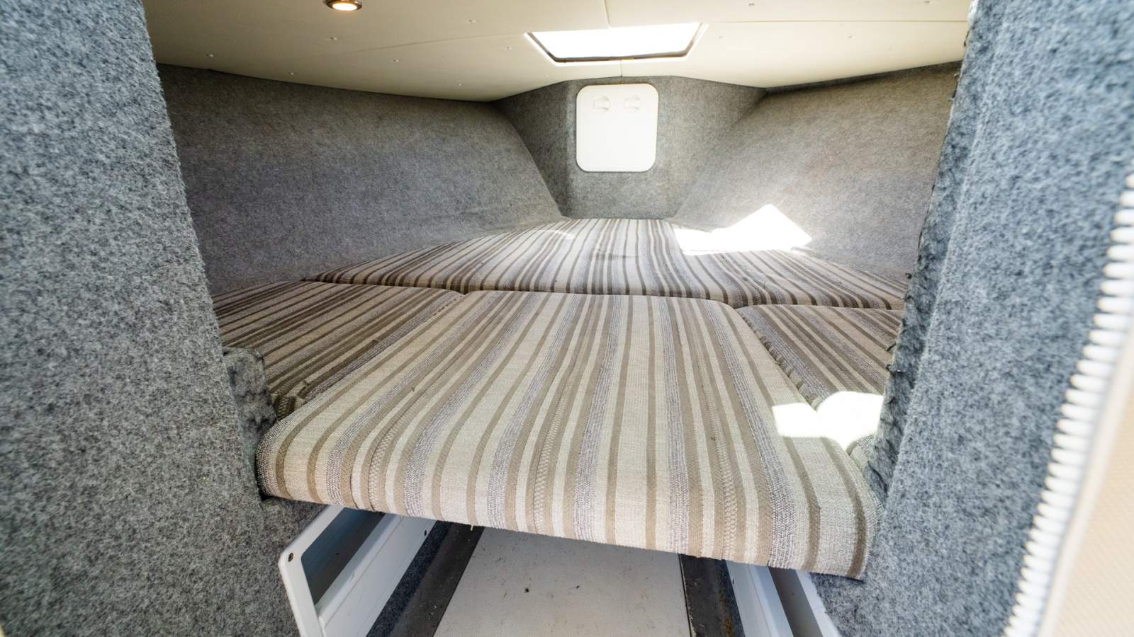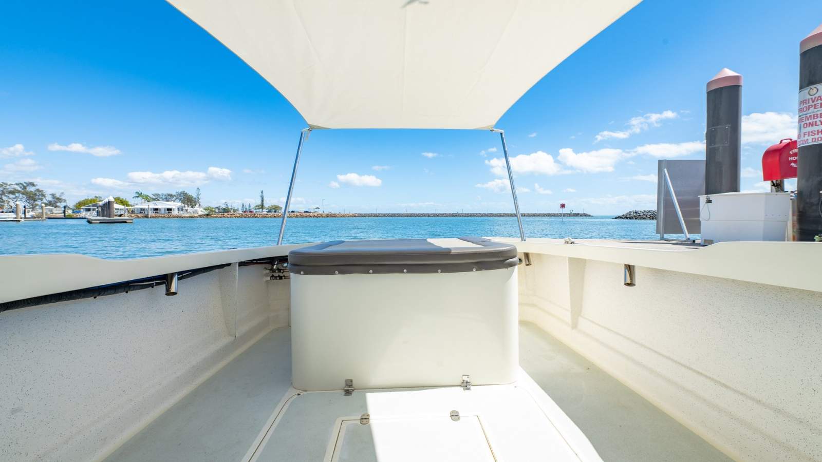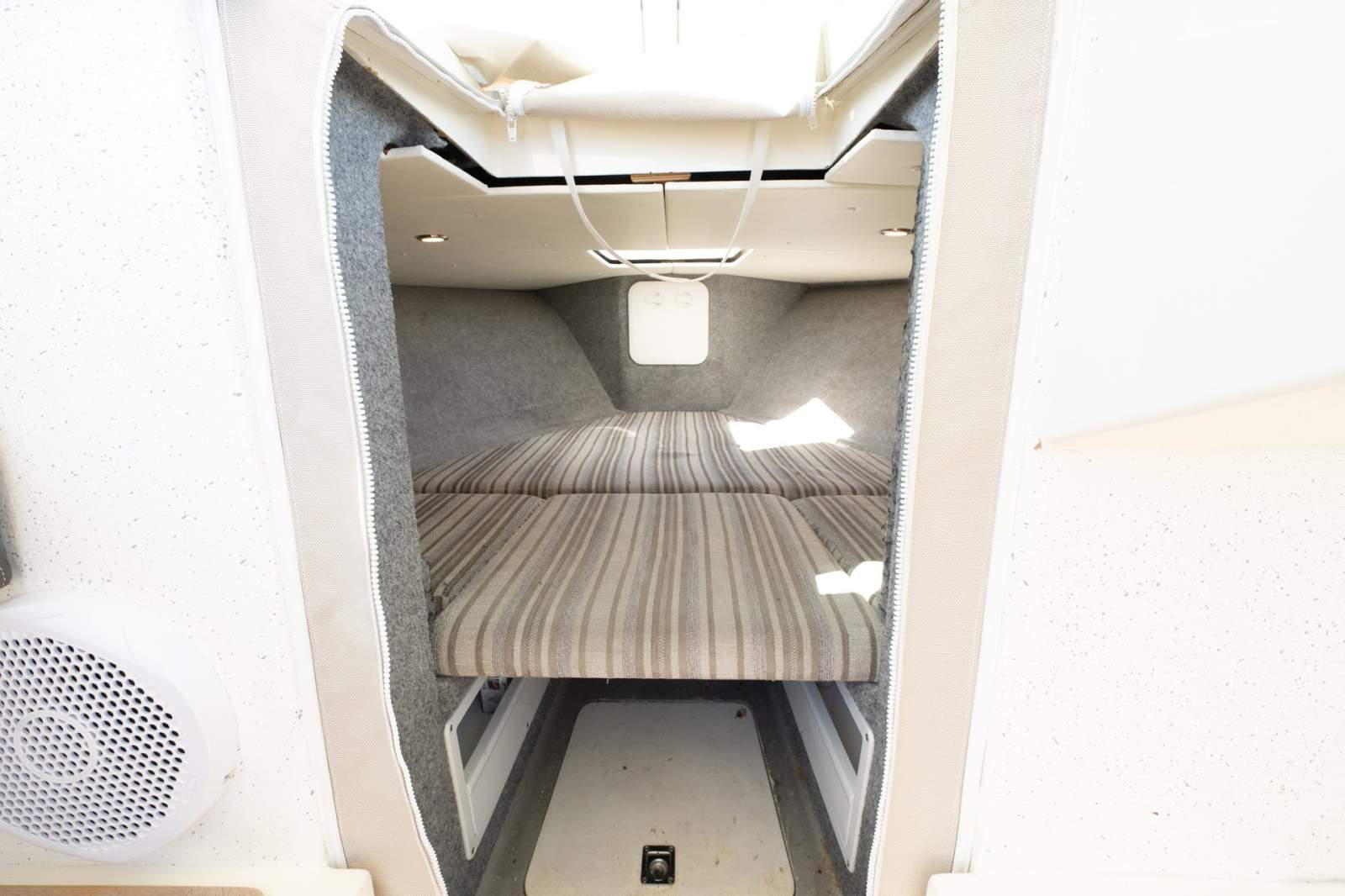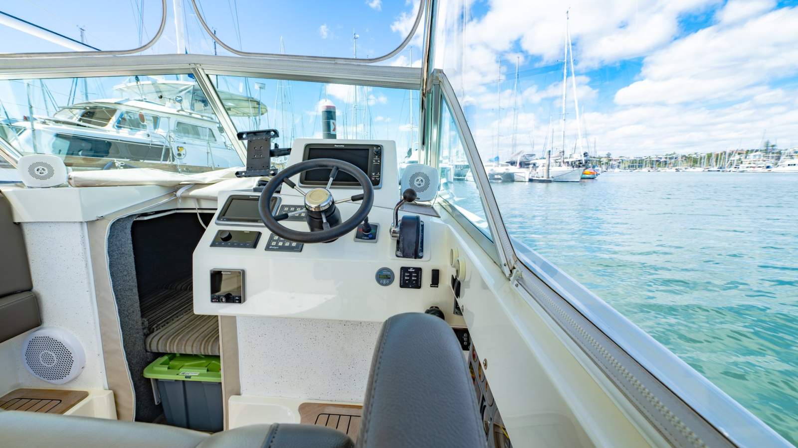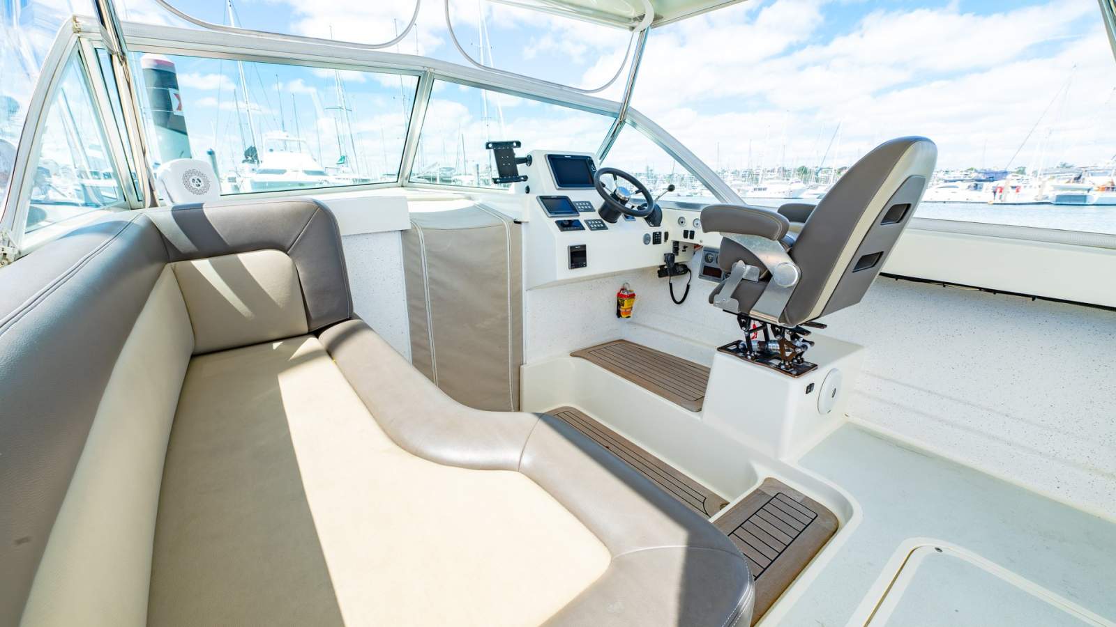 The forward day cabin features a comfortable V-berth/double bed, ideal for relaxing at anchor. It is well ventilated through the bow hatch and includes practical storage options. At the helm, you'll enjoy excellent 180-degree visibility through high-quality extruded clears. The layout is designed for ease of operation with dual Raymarine chartplotter/fishfinder displays, autopilot, and bow thruster controls all within easy reach.