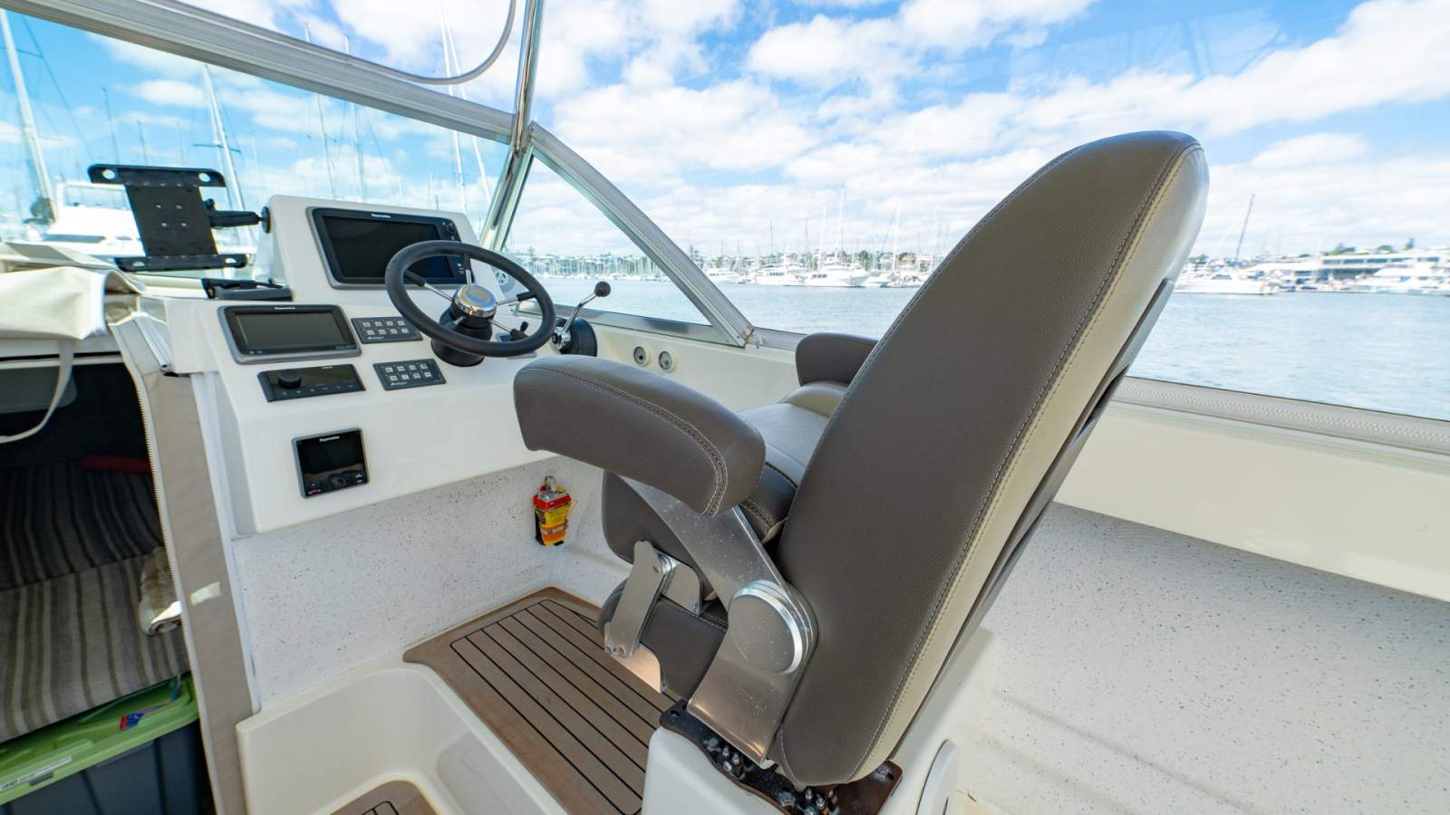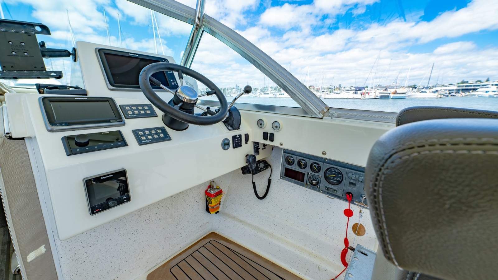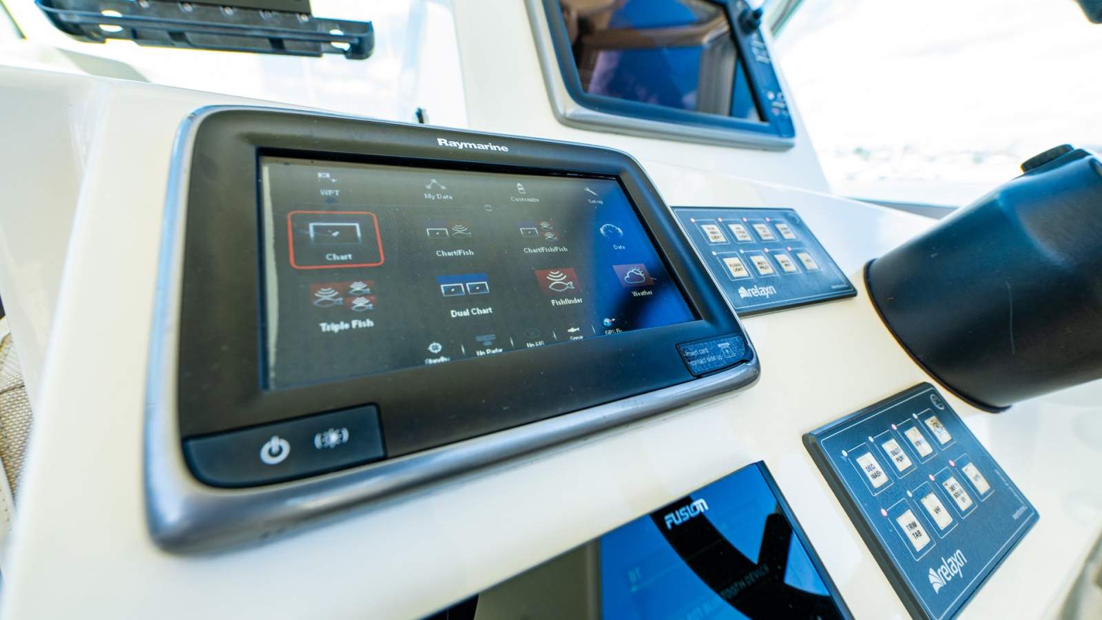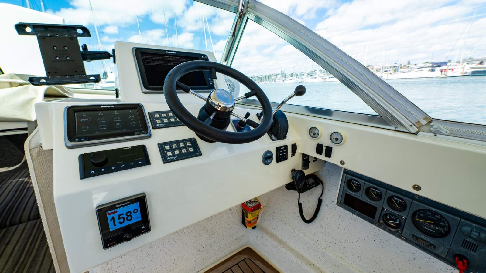 - Twin Raymarine helm chartplotters and instruments with ergonomic layout