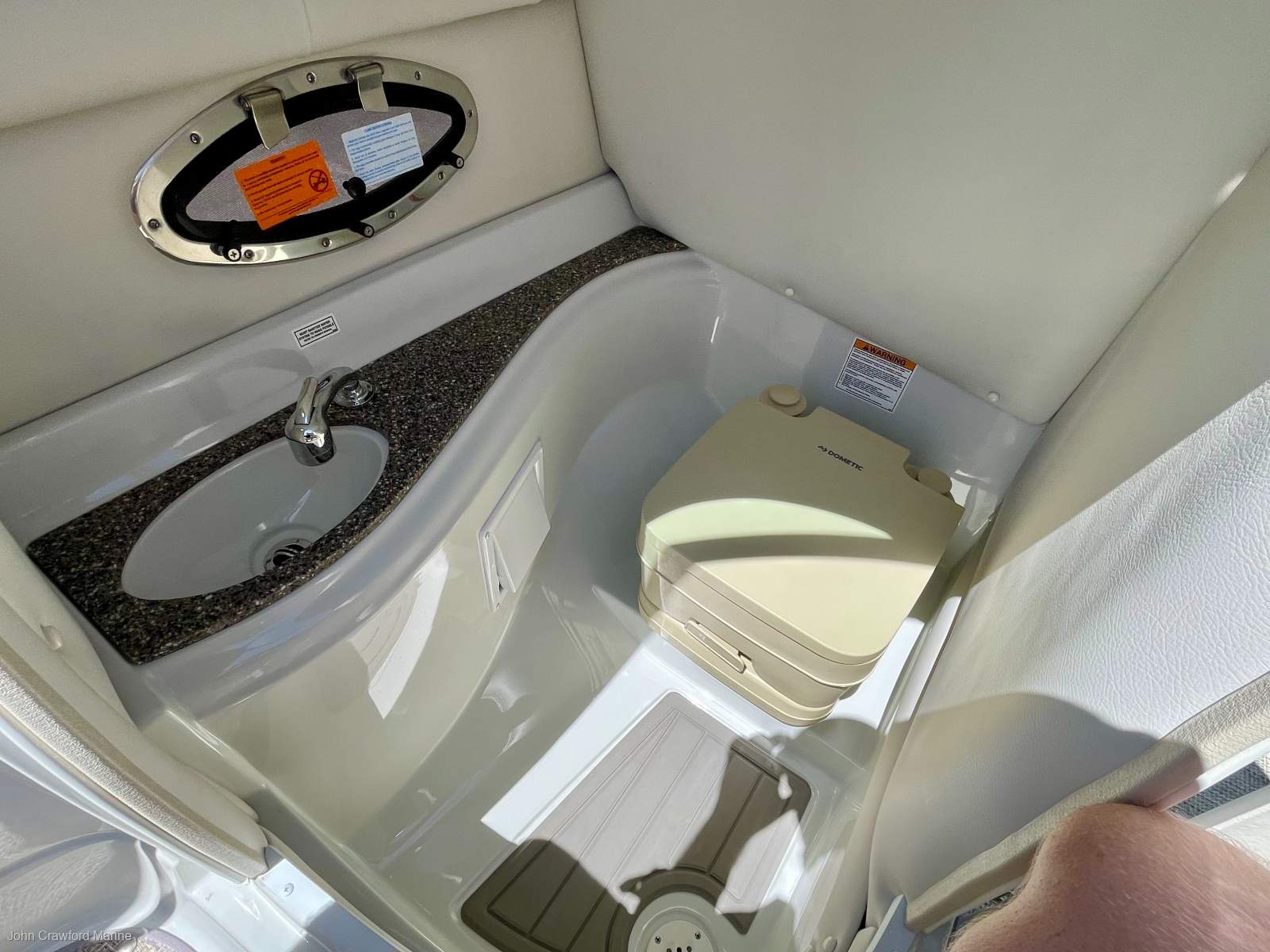 The social layout includes a versatile, electric-actuated rear sun lounge for effortless sunbathing, an integrated swim platform with a handheld transom shower, and a spacious, comfortable bow area with flip-up armrests. For added convenience, a fully enclosed head compartment provides privacy and comfort on the water, complete with a porta potty, sink, and an opening portlight.