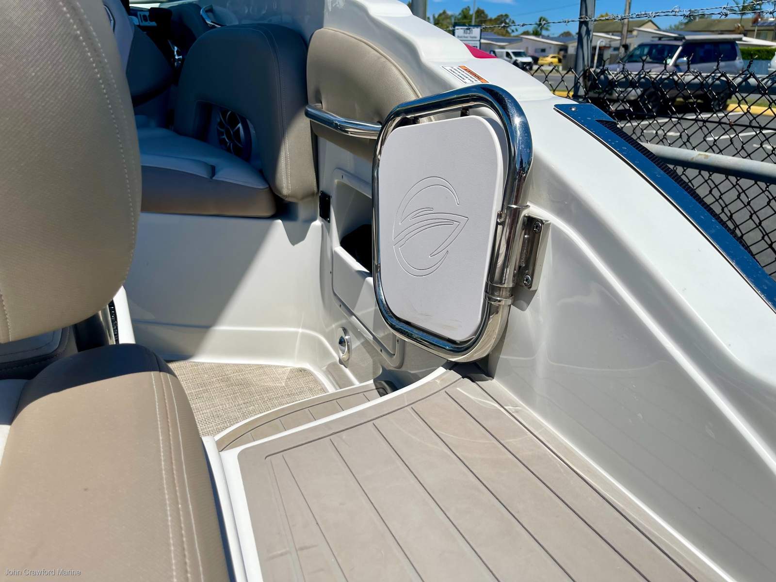 Ample storage is available in compartments under seats and within a walk-through transom, ensuring your gear is secure and out of the way. The helm is ergonomically designed with fingertip slide controls and a stainless steel steering wheel, providing a comfortable and intuitive driving experience.