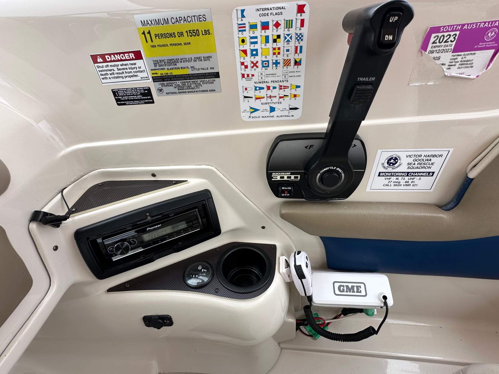 VHF Radio (recently replaced), new pioneer marine blue tooth radio and power aerial,