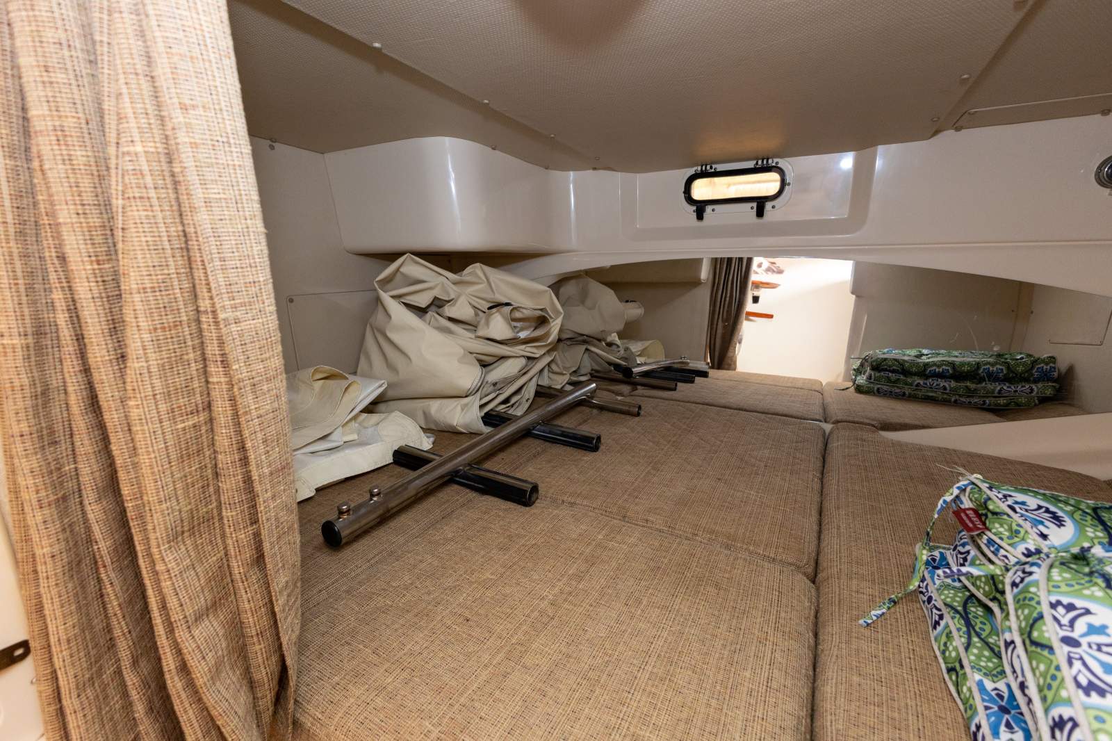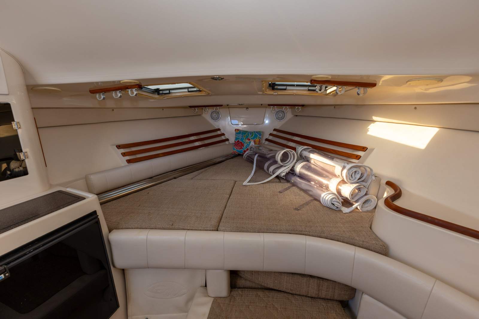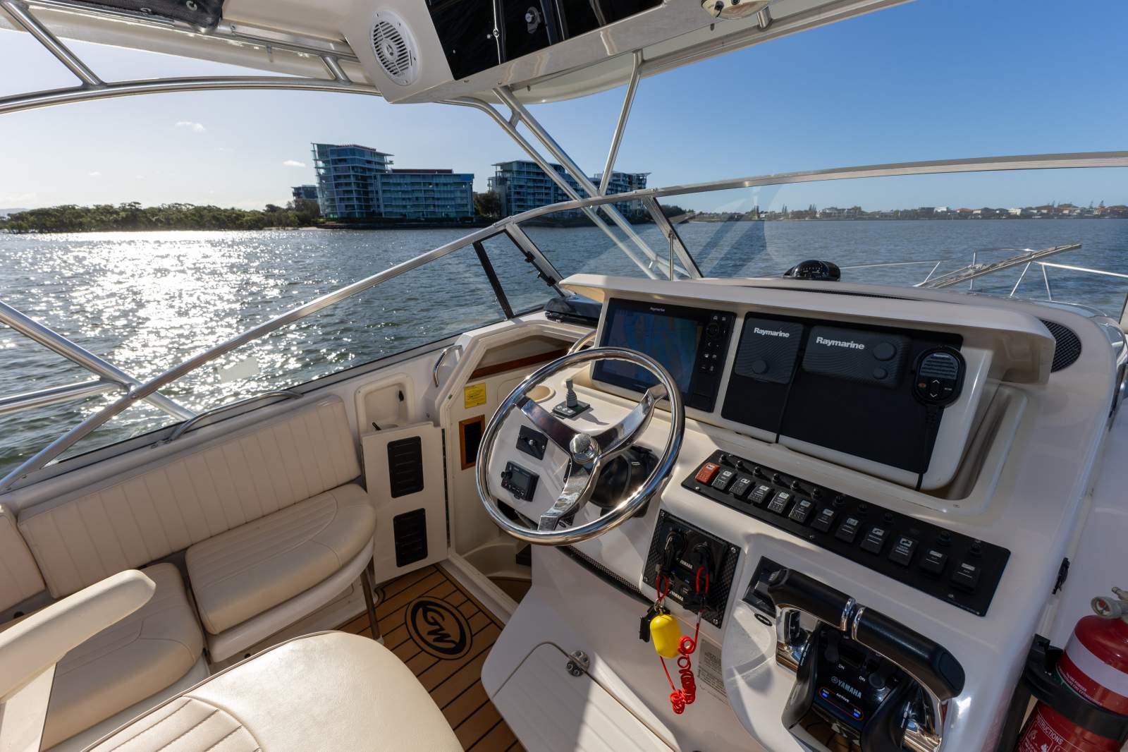 Well-equipped for both navigation and comfort, highlights include a 9" Raymarine HybridTouch display, Raymarine autopilot, Fusion stereo system, and Bennett trim tabs for optimal performance. Docking is made easy with a SidePower bow thruster, while onboard comfort is enhanced by Marine Air Systems air conditioning, an Isotherm 80L fridge and a two-burner Kenyon electric stove.