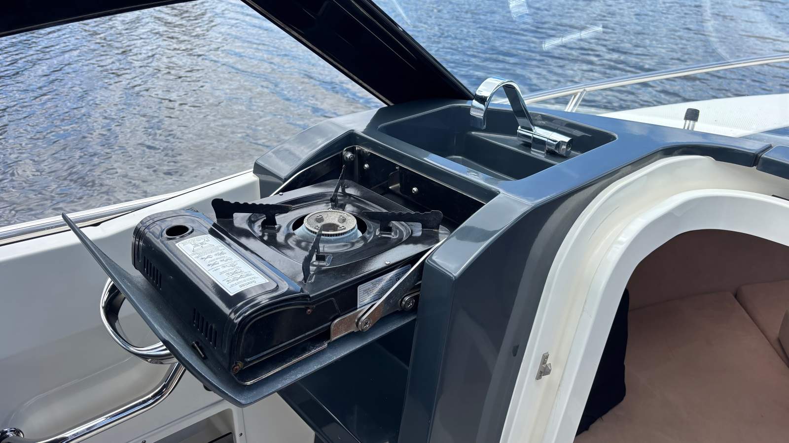 Below deck, enjoy a cozy forward cabin equipped with twin berths, a fridge and gas cooktop, and a sea toilet -- everything you need for comfortable day cruising or overnight stays.