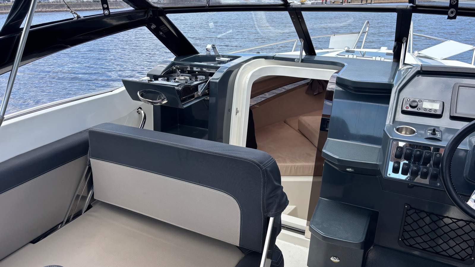 Designed for sun-soaked adventures and watersports, the spacious cockpit features a U-shaped lounge for up to seven guests, a foldaway table for added flexibility, and a wide transom platform ideal for swimming, gearing up for water activities, or simply soaking up the sun.