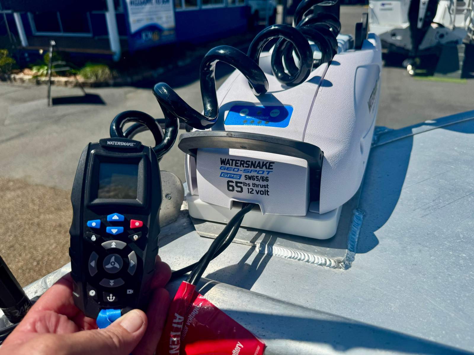 The angler that enjoys fishing the flats or impoundments, will love using the Watersnake bow mount electric motor. This motor is GPS enabled and is the 65lbs, GeoSpot SW65/66 12V model. Featuring use in saltwater, comes with a hand remote and powered by a deep cycle battery that is included in the bow battery box as pictured.