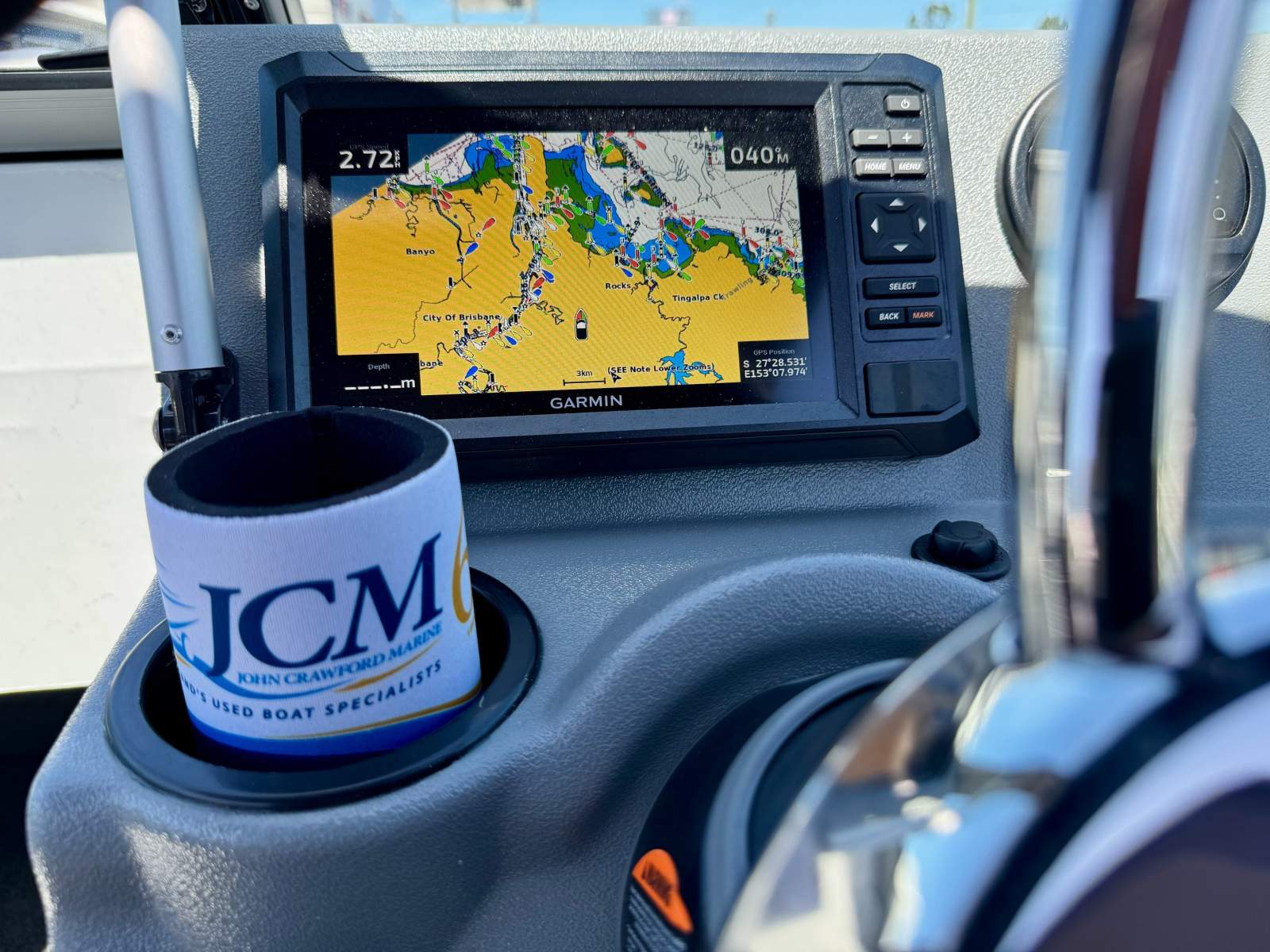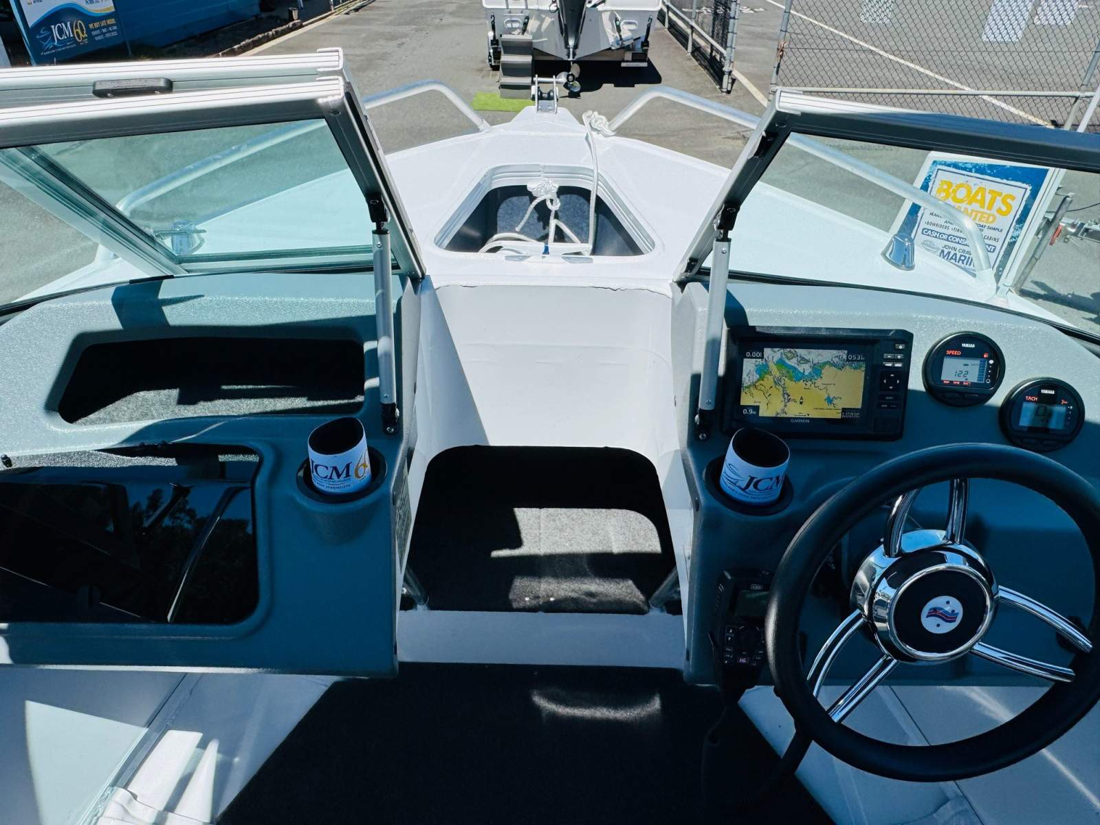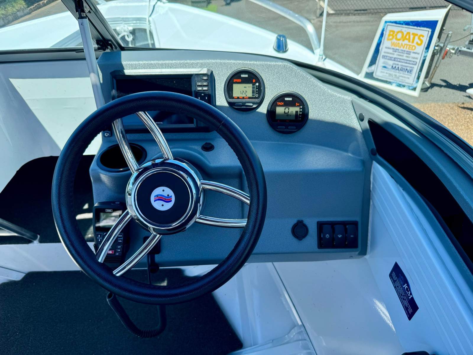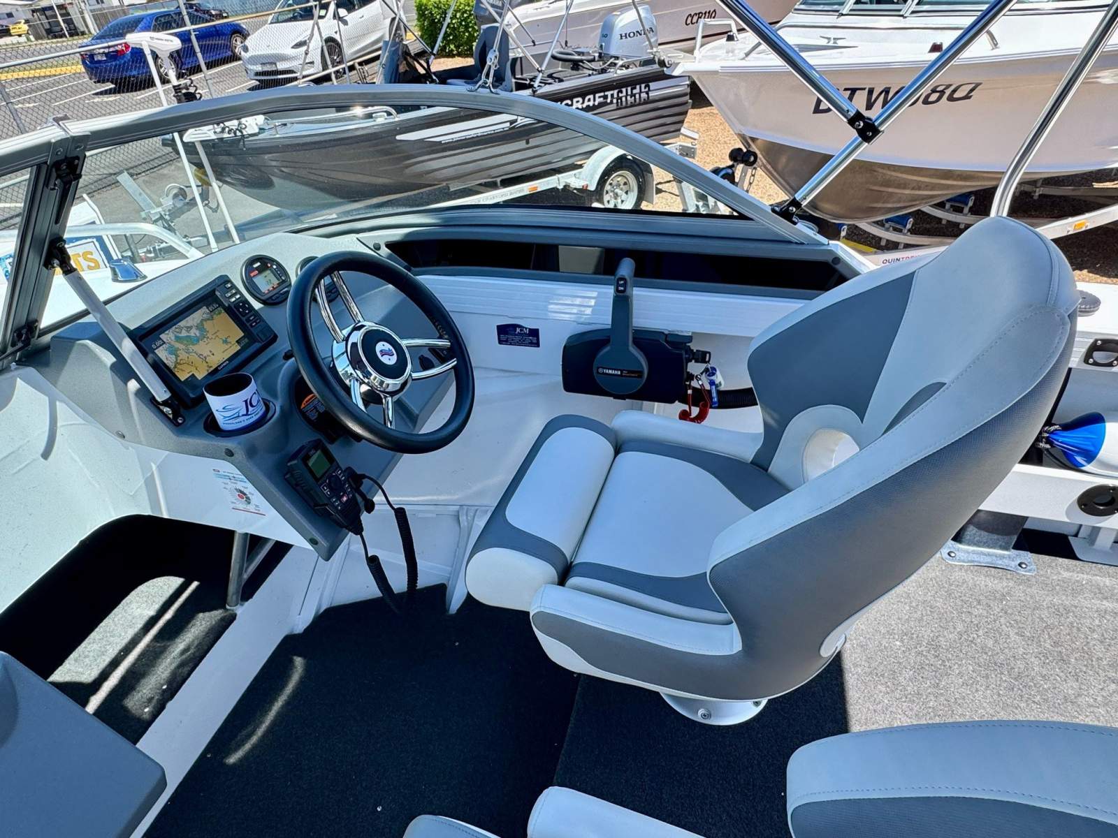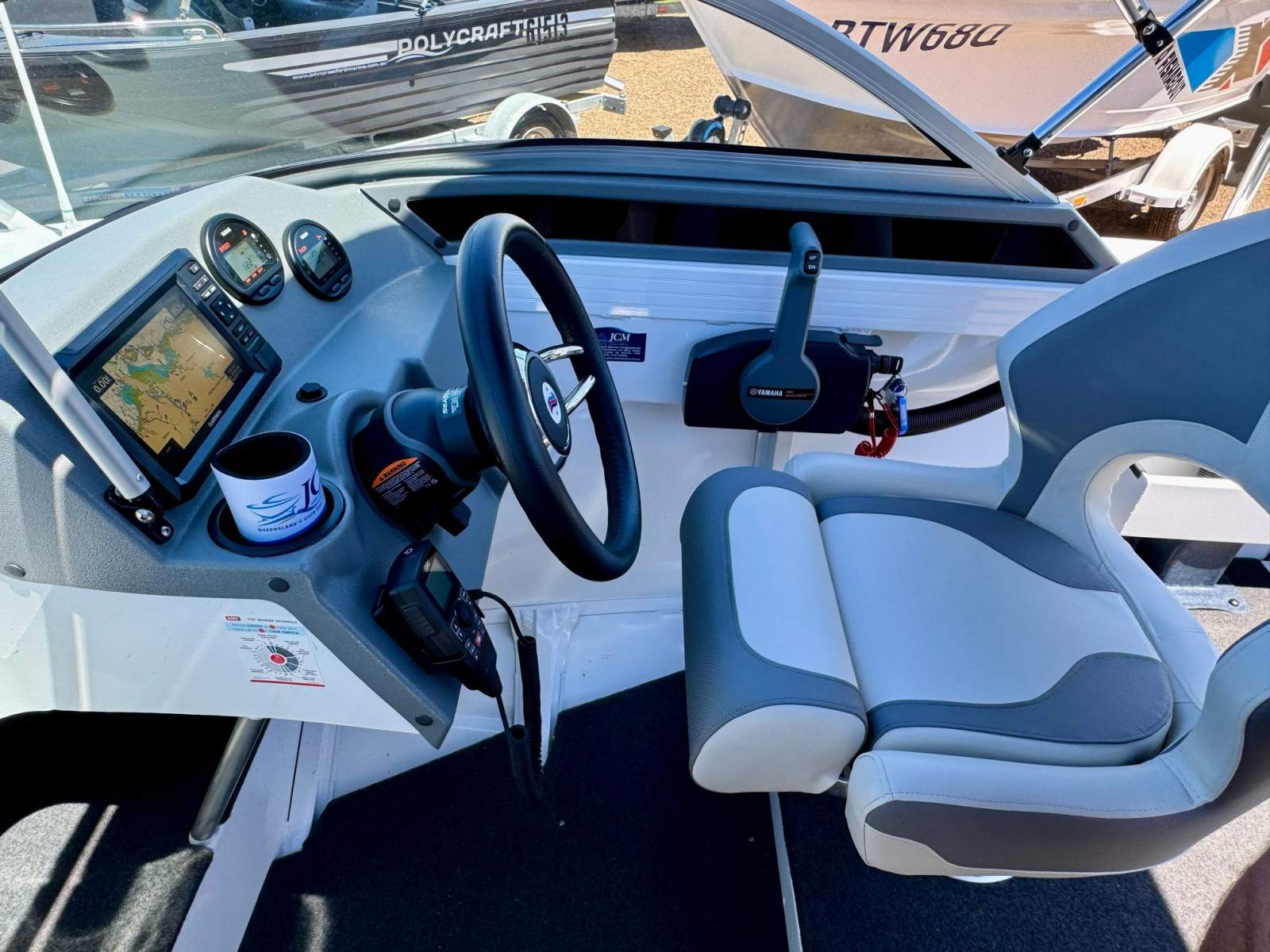 The dash is well arranged with 2 x Yamaha digital engine gauges and a quality Garmin Echomap UHD2 75cv 7.5" colour screen MFD unit that incorporates sounder/Fishfinder/GPS/built in mapping information. For on water communications, a GME MC750B VHF radio is neatly installed.