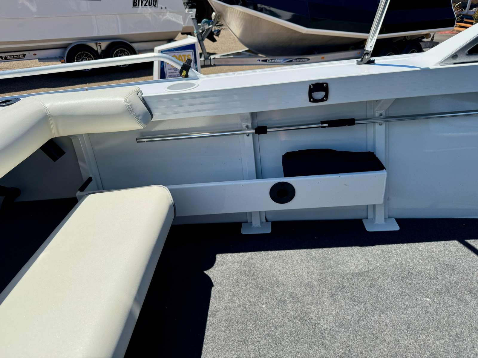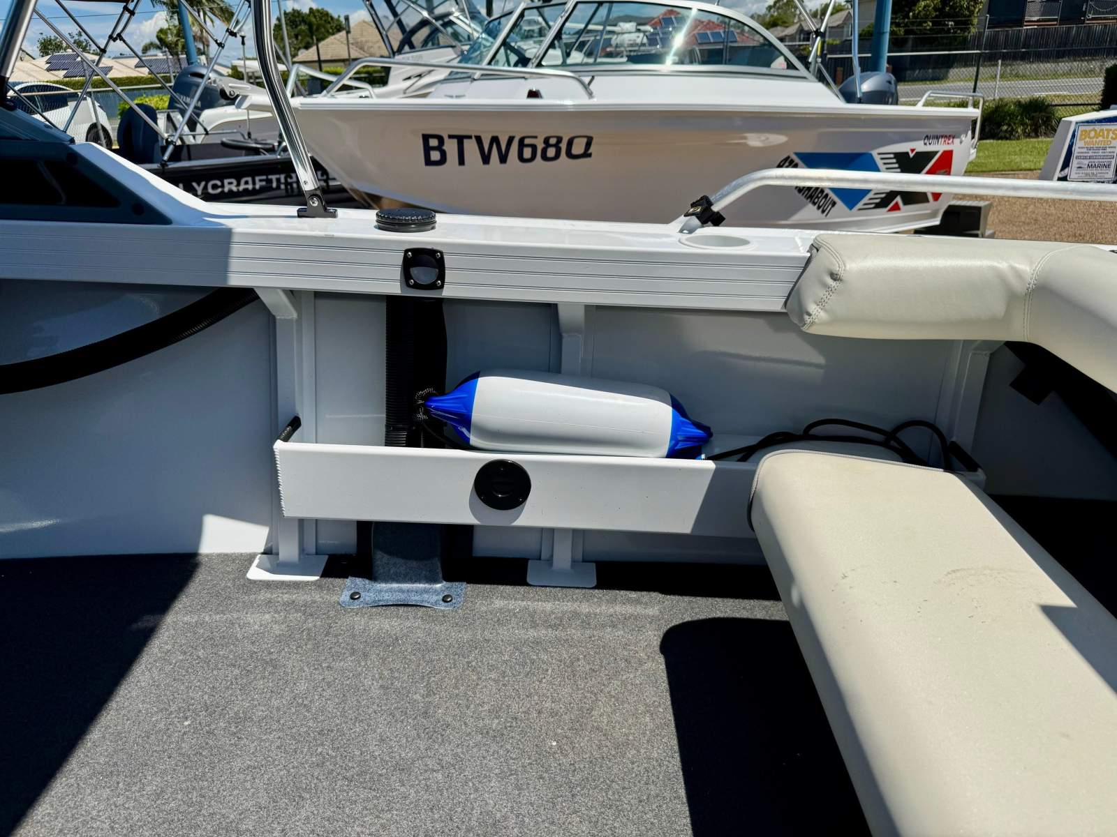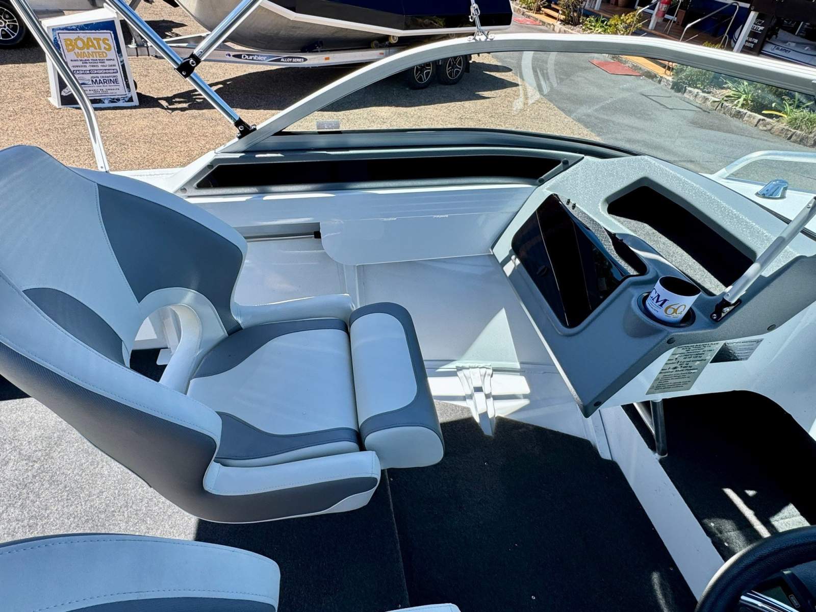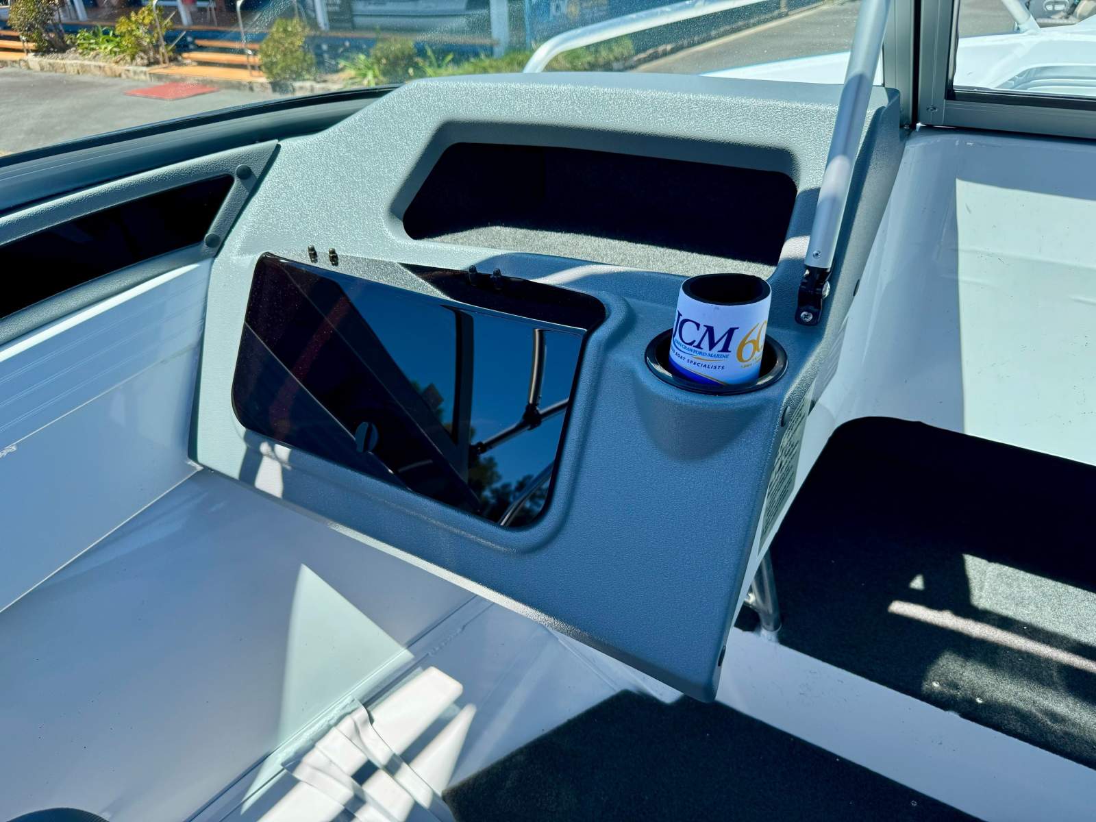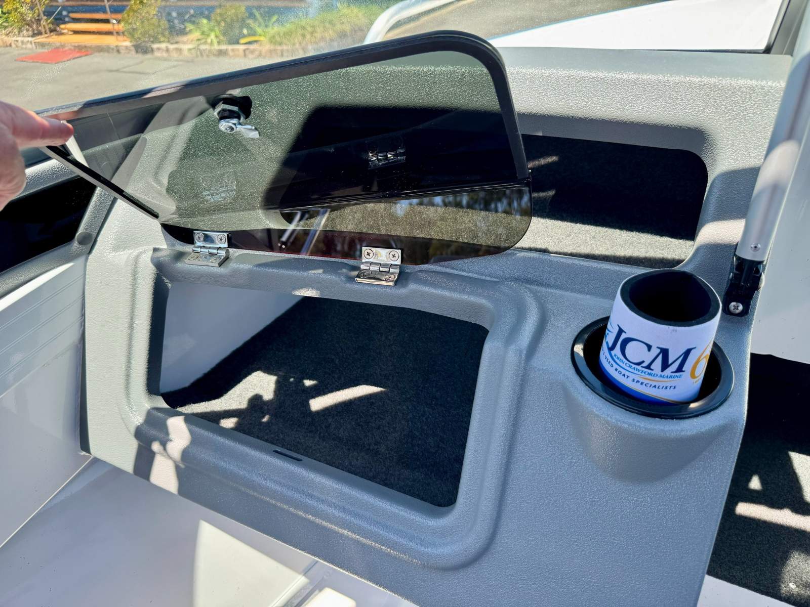 Access to the ground tackle stored in the anchor well is made easy with the centre piece of the windscreen being hinged and a lean through dash incorporated in the design. The dash also has a storage glove box for the car keys, phone and wallet as pictured.