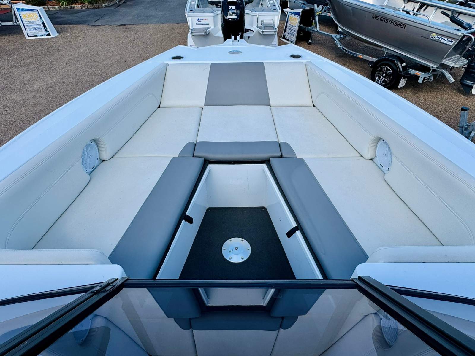 For those that like their tunes afloat, the boat rocks a quality sound system from Fusion, linked to 4 Fusion speakers that can certainly push out some sound! The Bluetooth stereo is neatly installed in the passenger side glove box along with 12v power outlets to charge the phone etc.